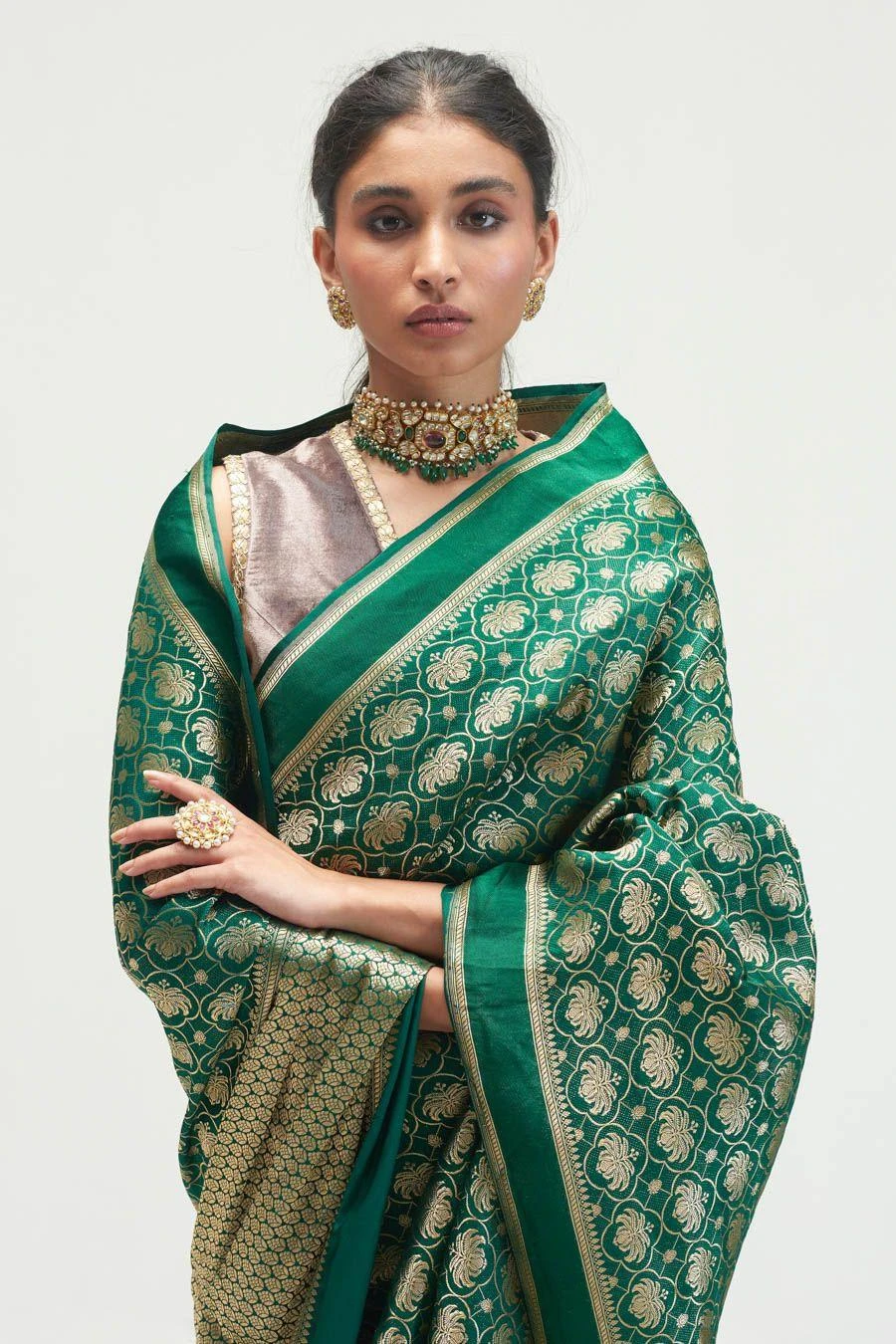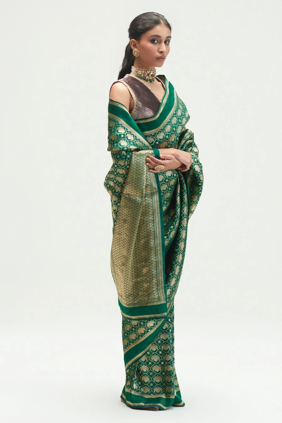 Maximise the life of your wardrobe with this timeless sari. This brocade silk sari is a trousseau must-have. It is exuberantly enhanced with intricate zari work and is offset with an equally versatile blouse piece.