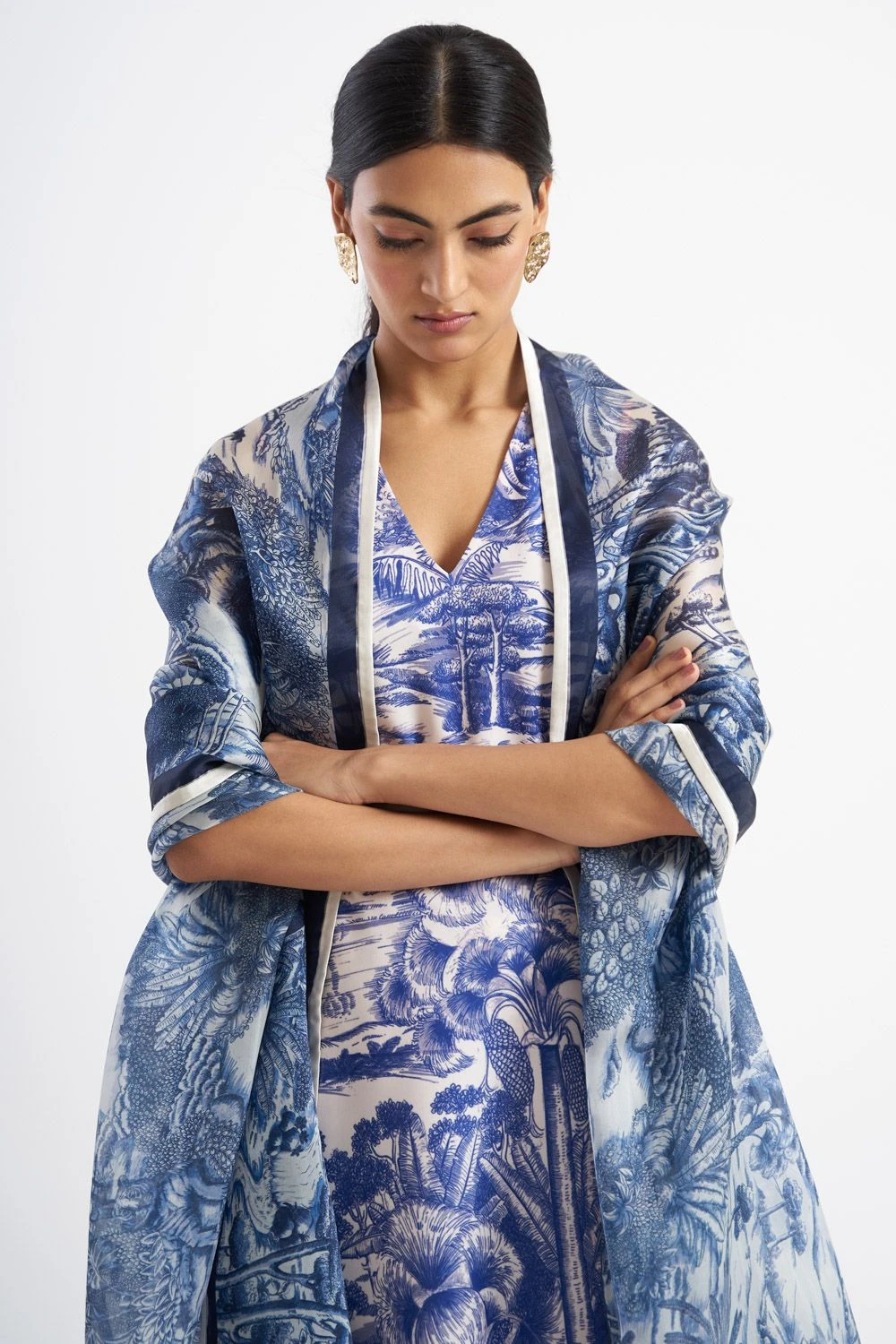This Ranthambore tanzenite dupatta is sheer love. Spun in light silk satin organza, soft to the skin, it makes a great accessory to enhance your ethnic wear. It can be paired with a coordinating kurta set from the collection.