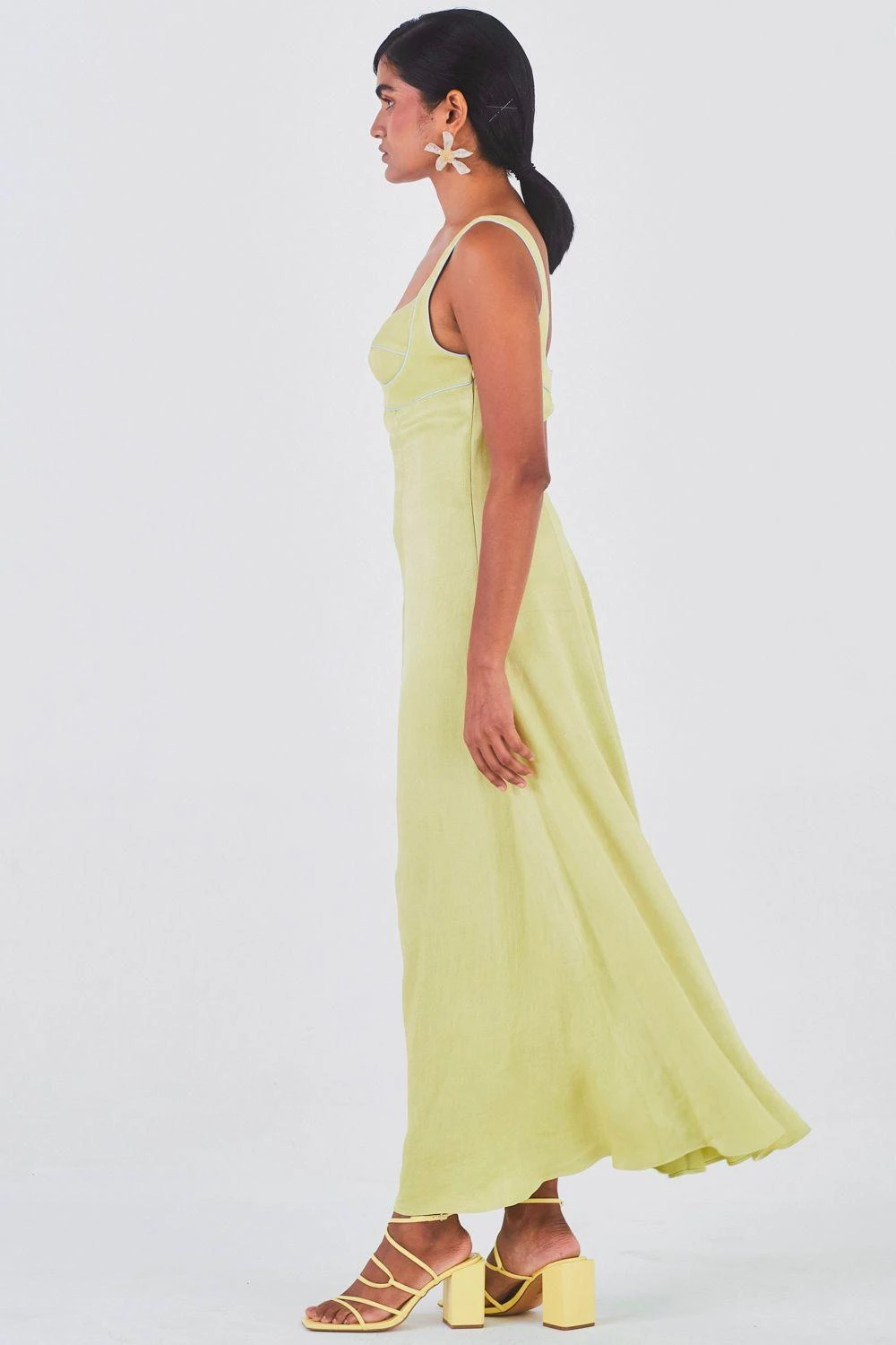 This dress falls in the realm of luxe minimalism. Crafted in orange fiber fabric, this ankle length slip dress has a bustier style top accentuated by alternate colour piping. Style it with dainty jewellery to complete the look.