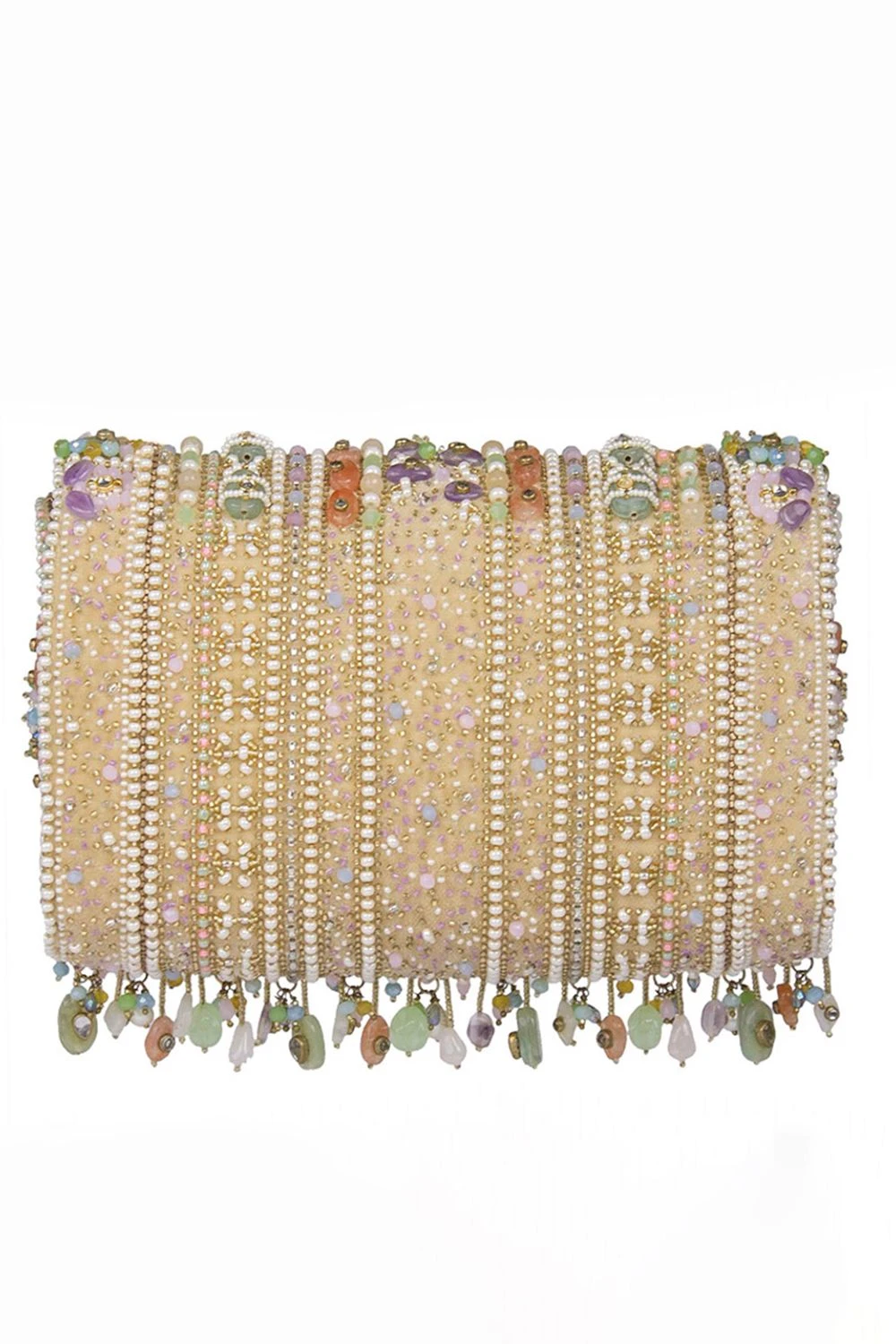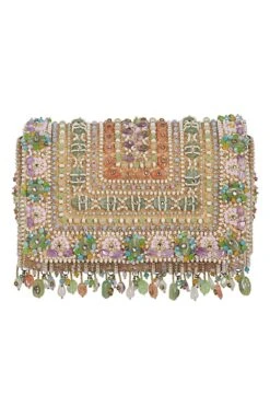 Inspired by opulent encrusted Jadau & Polki jewellery, the Amara Clutch is embellished with semi-precious amethyst, quartz, stones, kundans & Japanese beads. It is finished with asymmetrical handmade tassels at the bottom.