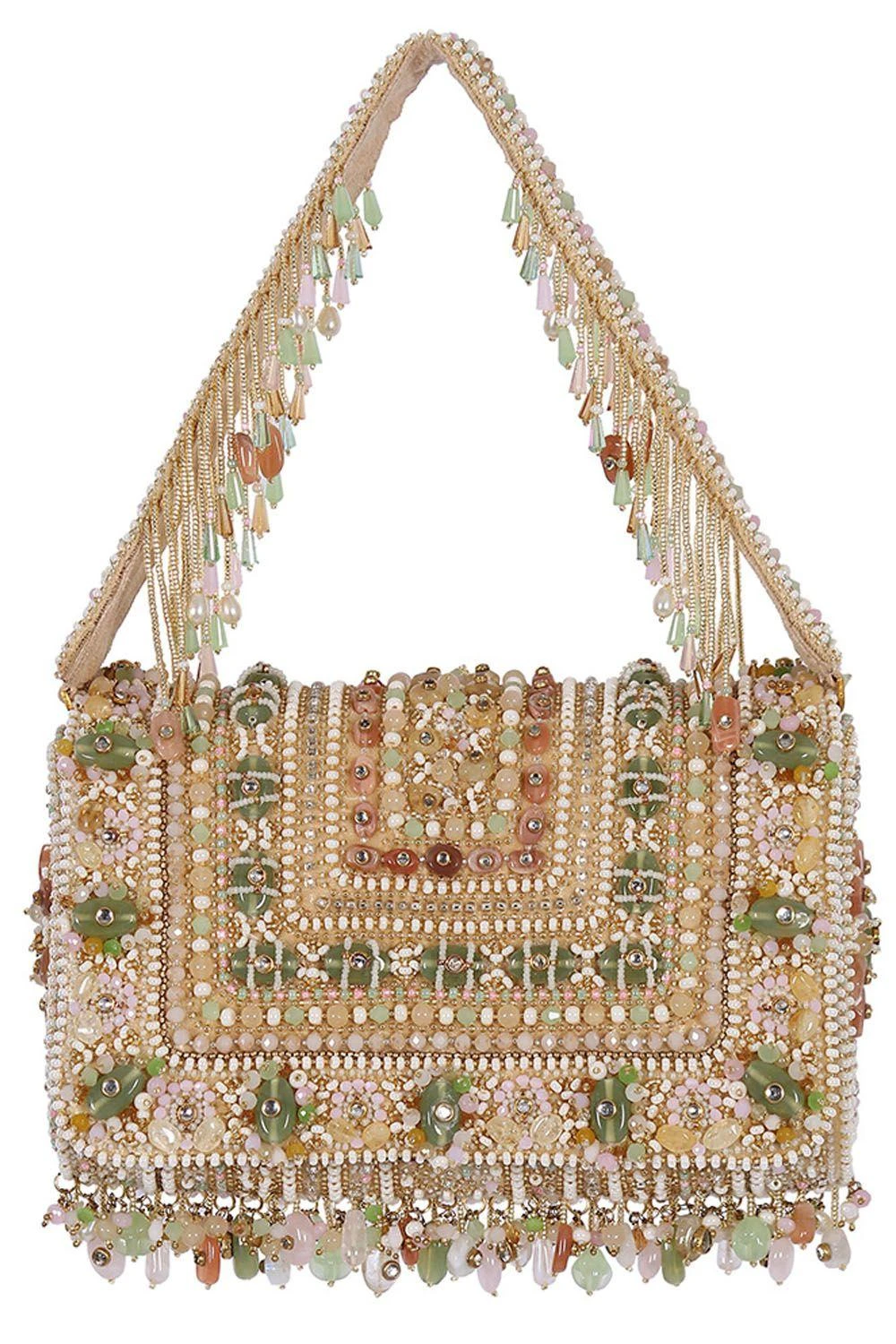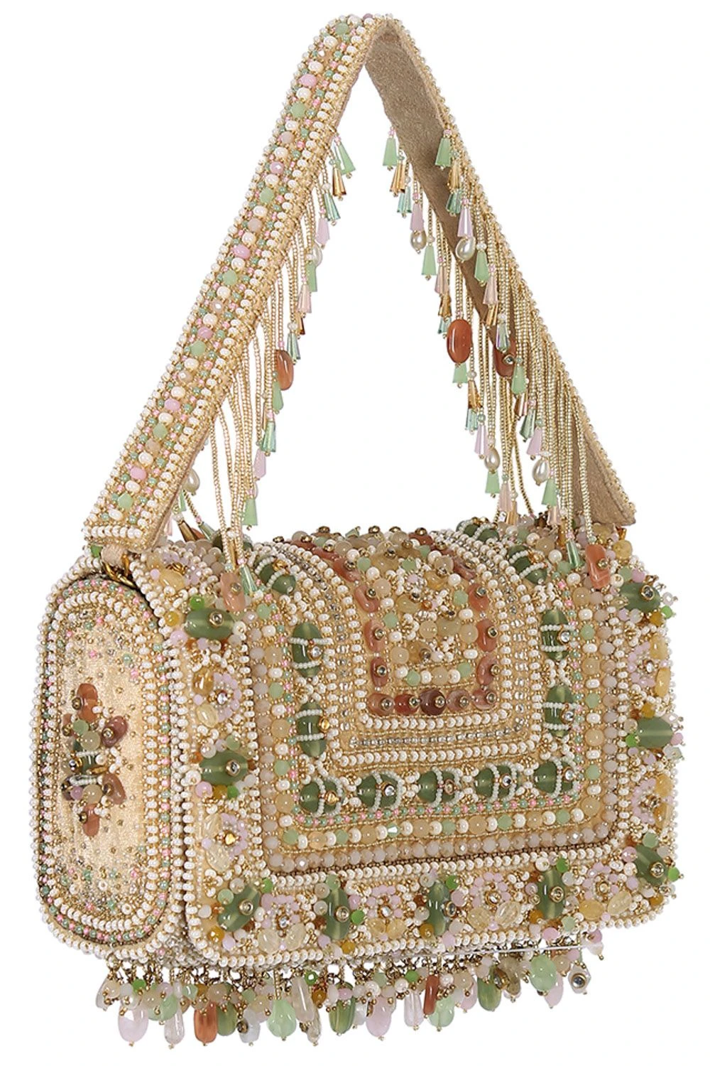 Inspired by opulent encrusted legacy Jadau and Polki jewellery, this pouch is embellished with semi-precious quartz, stones, kundans & lustrous Japanese beads. It is finished with delicate asymmetrical handmade tassels at the bottom.