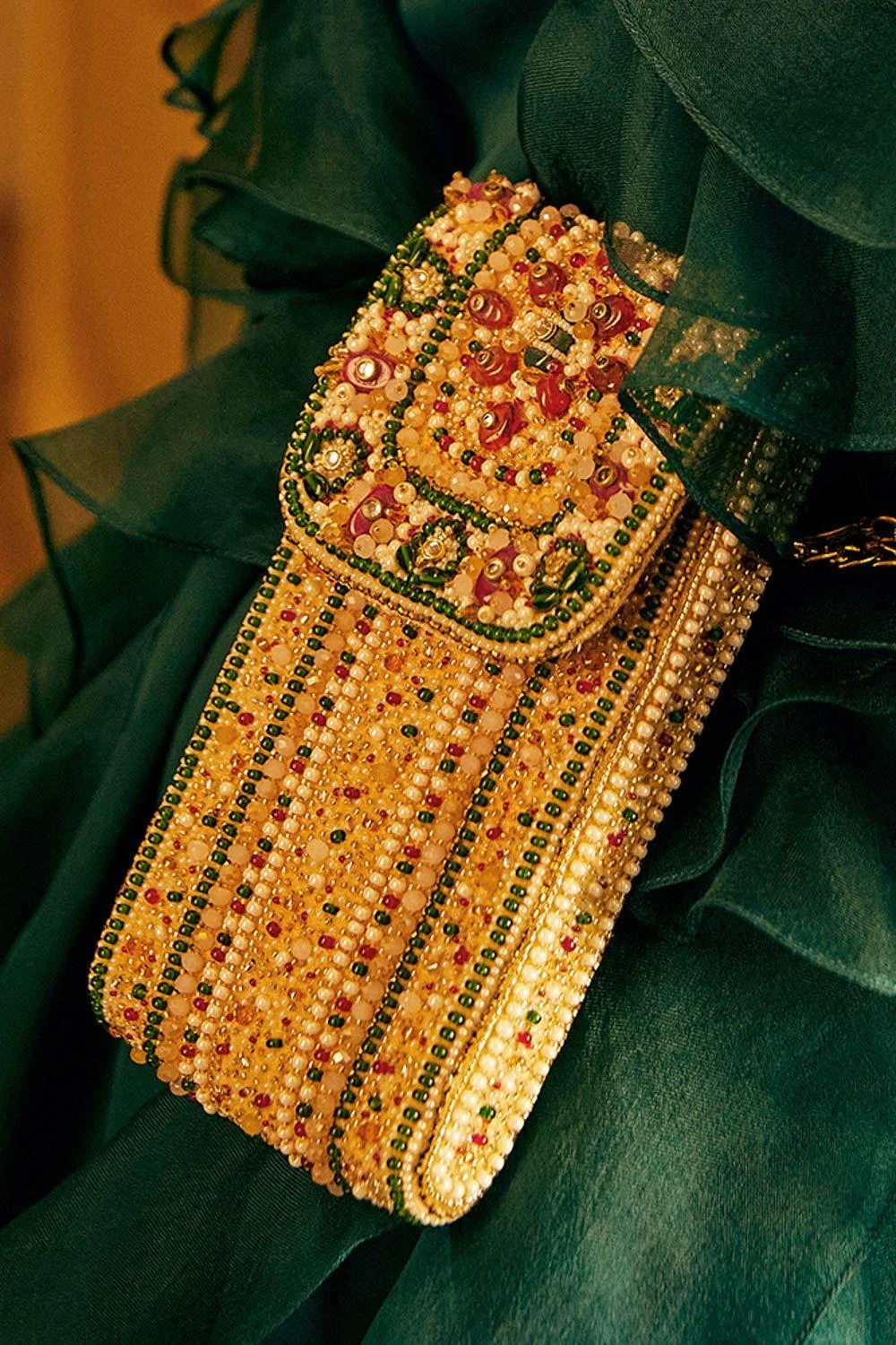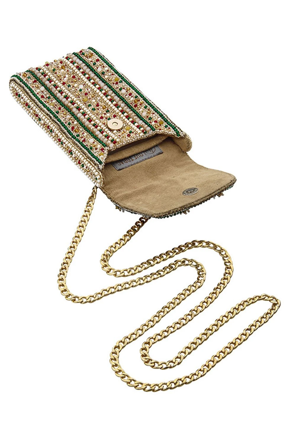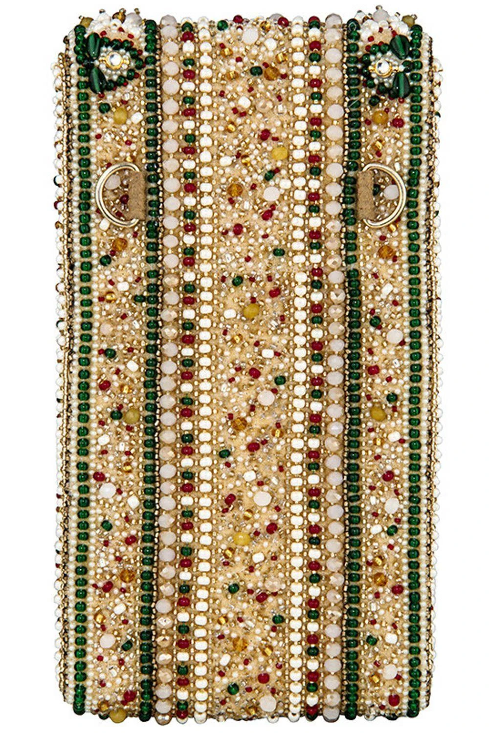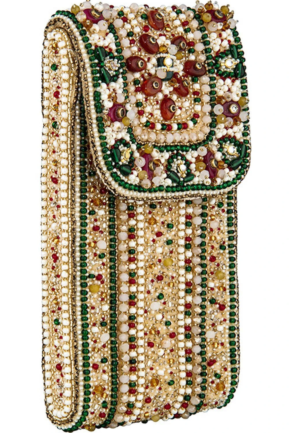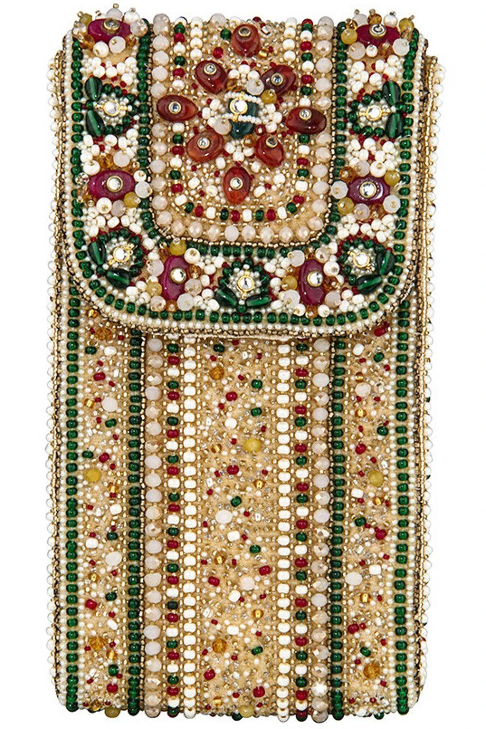 The Amara Mobile Pouch Ruby Emerald is a neomodern mini bag to carry your smartphone on the move. it is embellished with semi-precious rubies, emeralds, stones, nuggets with kundans and lustrous gold silver Japanese beads.