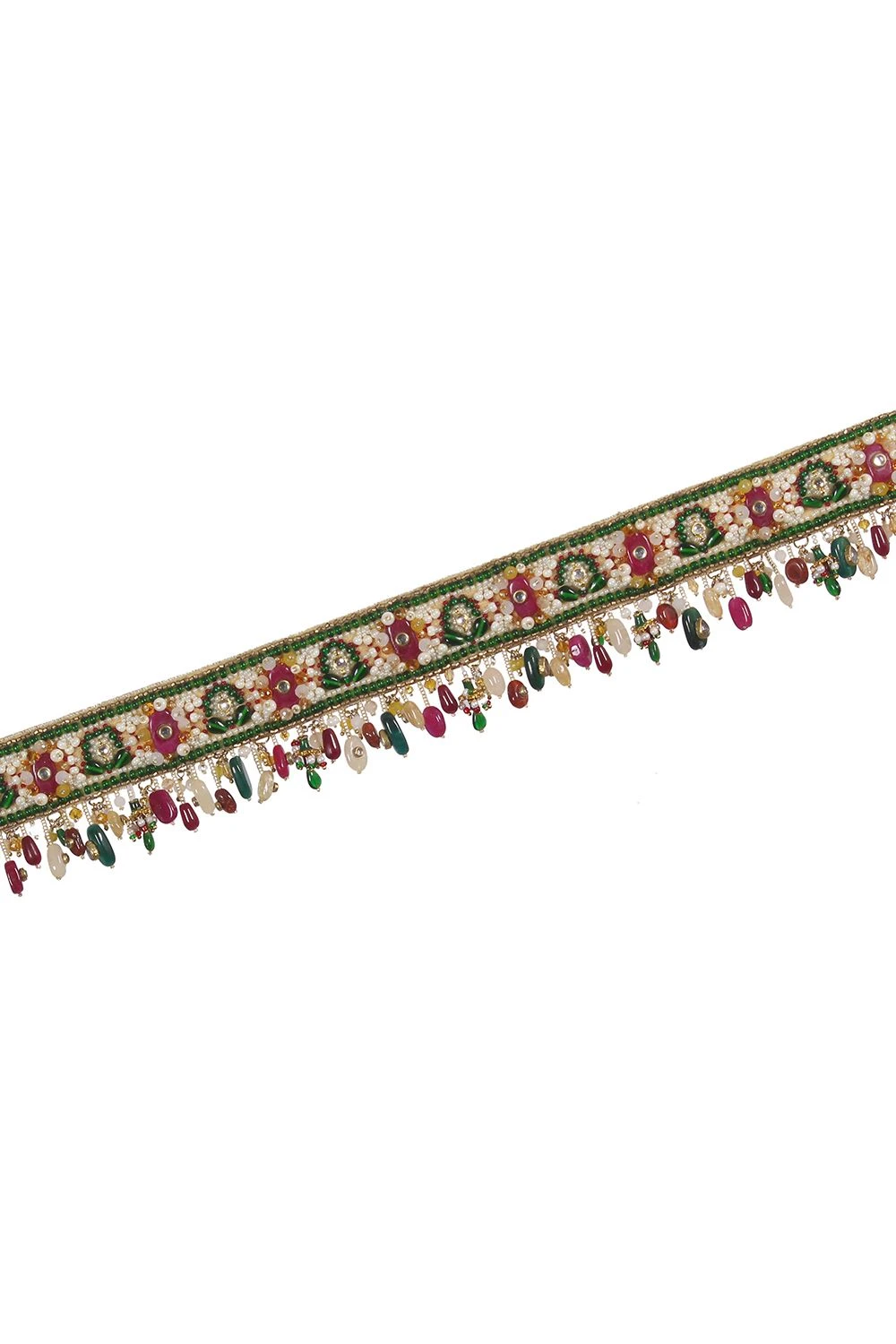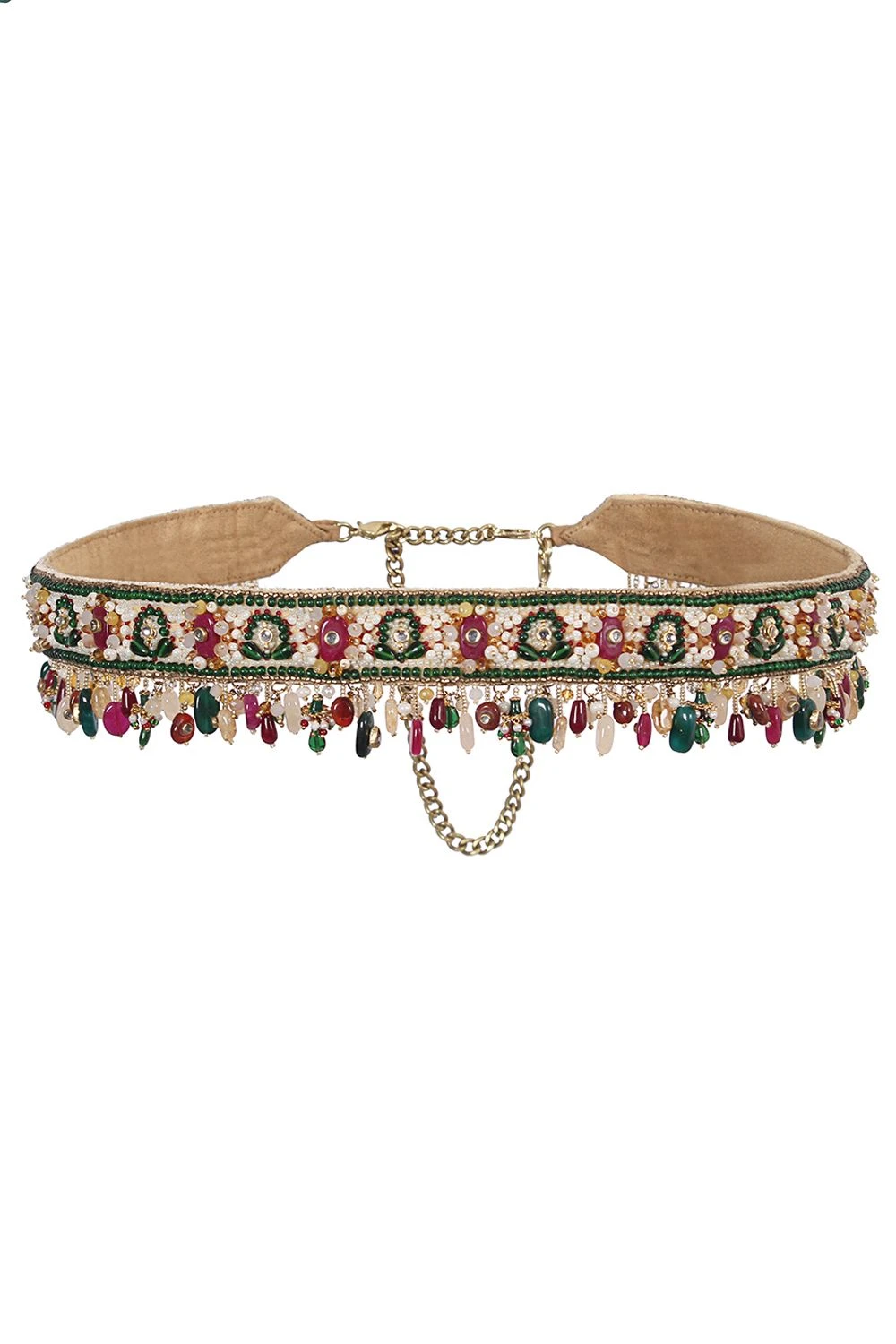 The amara waist belt is embellished with semi-precious Rubies, emeralds, nuggets, stones, kundans and lustrous gold silver Japanese beads. It is finished with delicate asymmetrical handmade tassels at the bottom.
