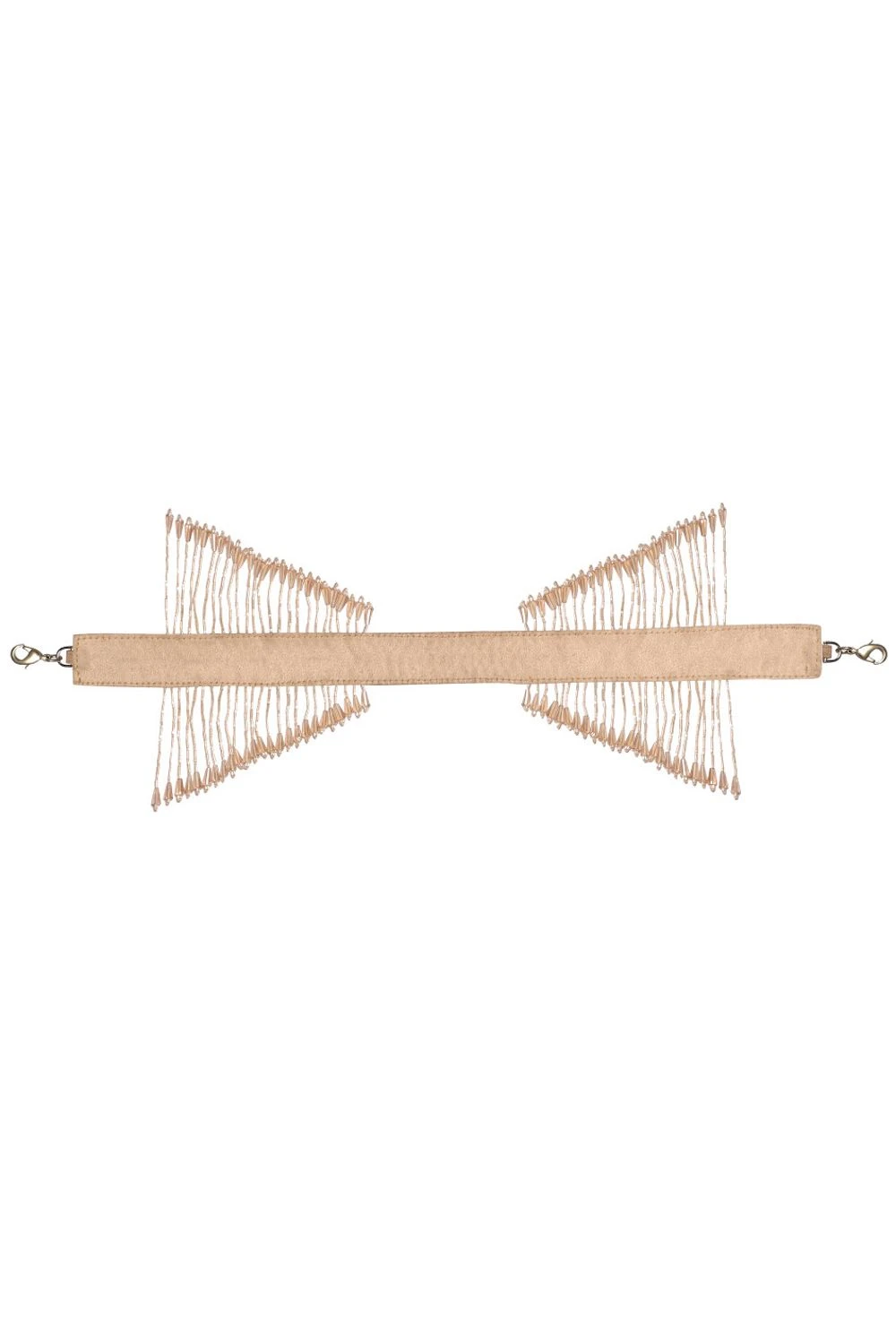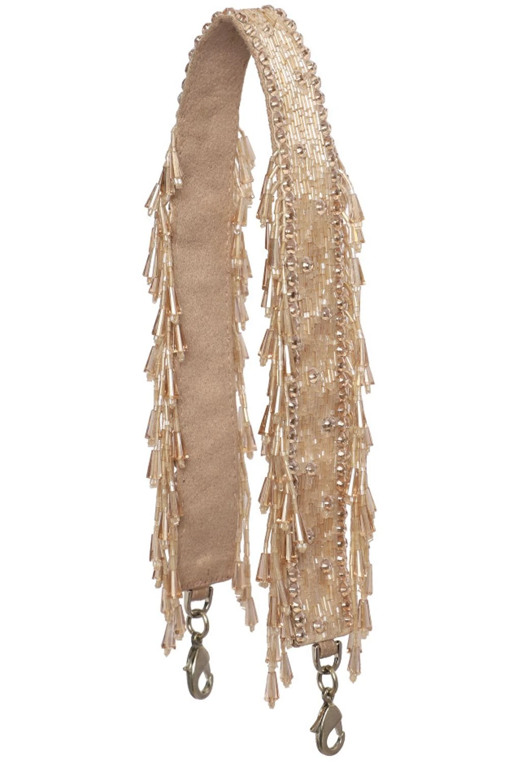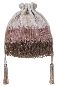 This regal drawstring pouch can be styled as a sling bag and a potli. It is decadently hand embroidered with Japanese glass beads with wristlet and a chain handle.