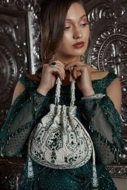 This regal pouch is decadently hand embroidered with lustrous semi precious stones , tinted glass crystals & Japanese micro beads embedded in freshwater and cultured pearls