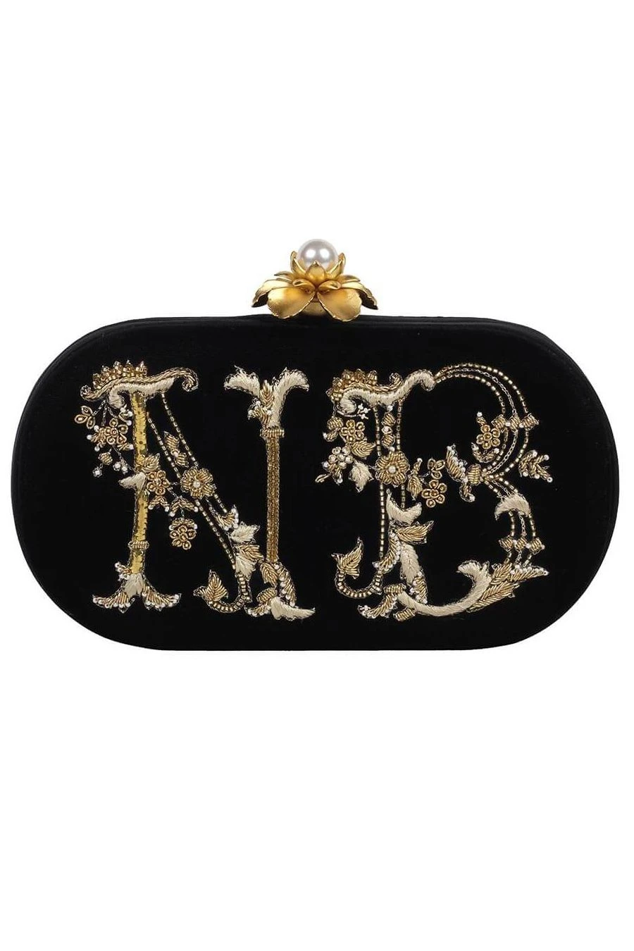 This oval clutch is hand embroidered with initials in zardosi using fine dabka,beads and threads. It comes with a handmade flower lock and long chain handle. This versatile accessory can be paired with western, fusion and ethnic ensembles.