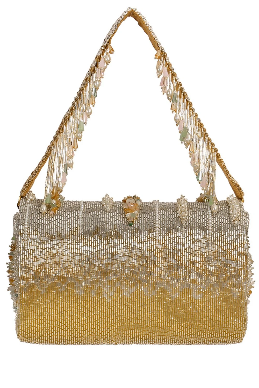 This clutch features an assortment of gold, silver & quartz hued semi precious stones & nuggets, iridescent crystals & cultured pearls arranged in an abstract form over a metallic ombre gold and silver Japanese beads base with an embellished handle.