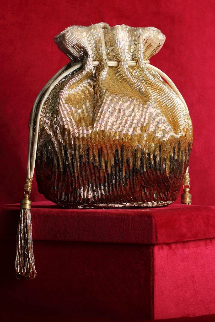 This bejewelled gold potli is decadently embellished with delicate Japanese glass beads with a wrist and long chain handle. This versatile accessory can be paired with western, fusion, and ethnic occasion ensembles.