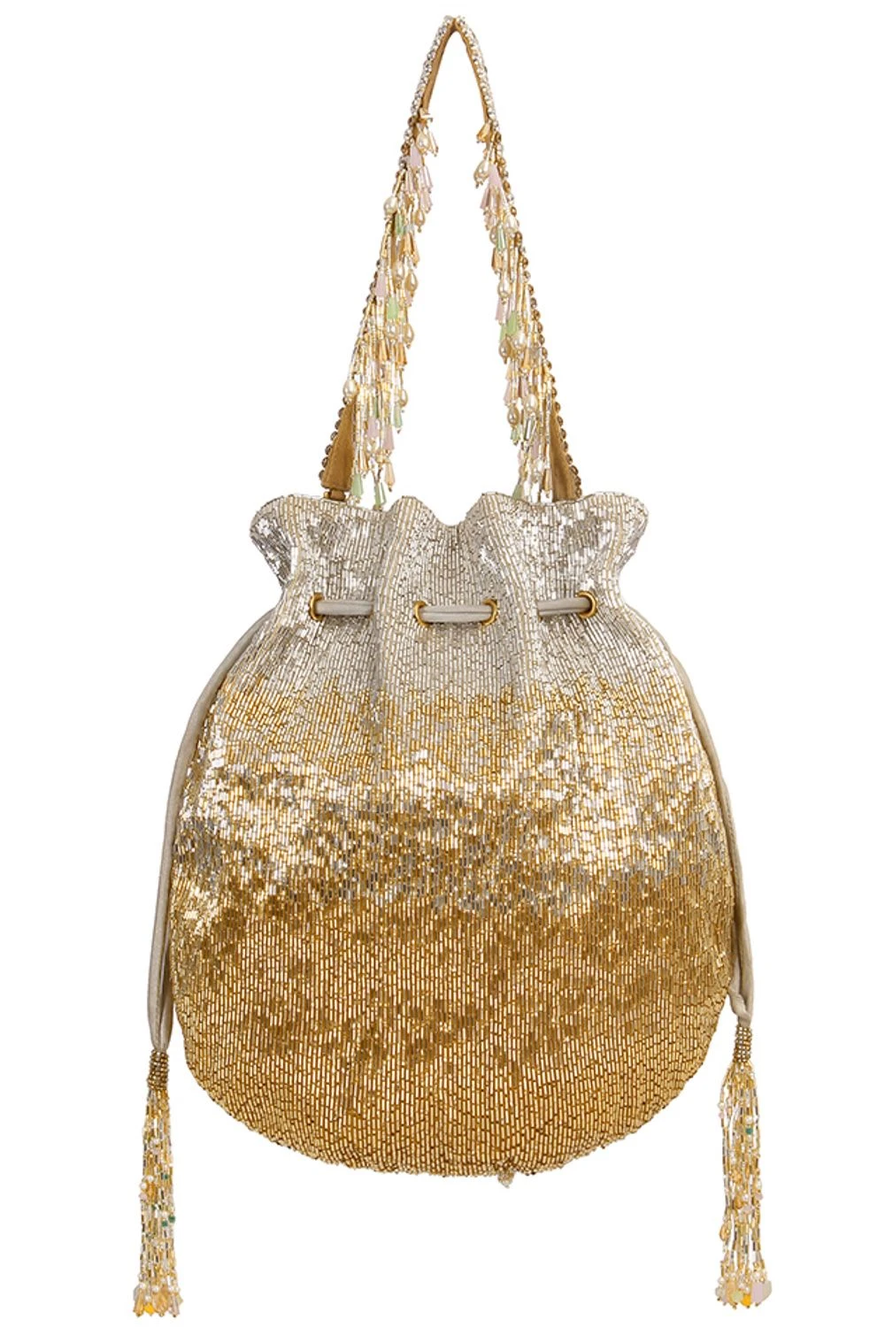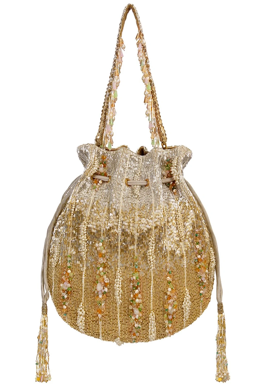 This gold potli bag features an assortment of quartz hued stones, nuggets, cultured pearls and iridescent crystals arranged in an abstract form over a pearlesque ivory base. The addition of an embellished handle makes it a statement accessory.