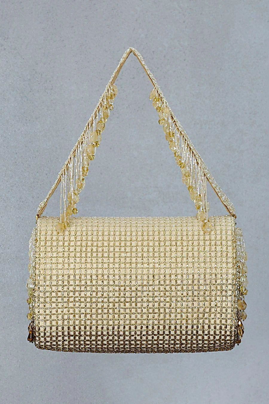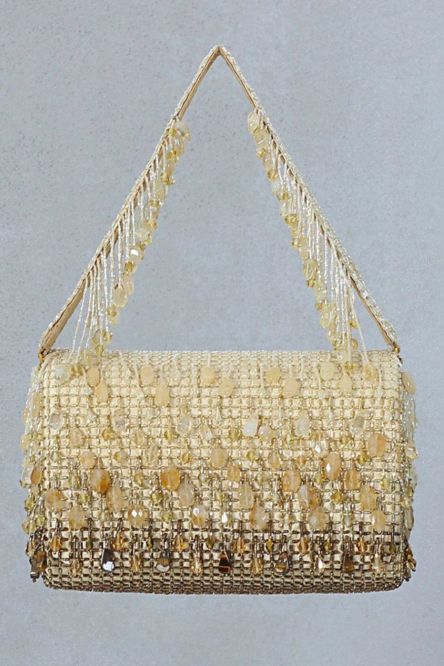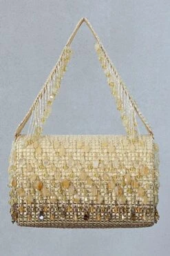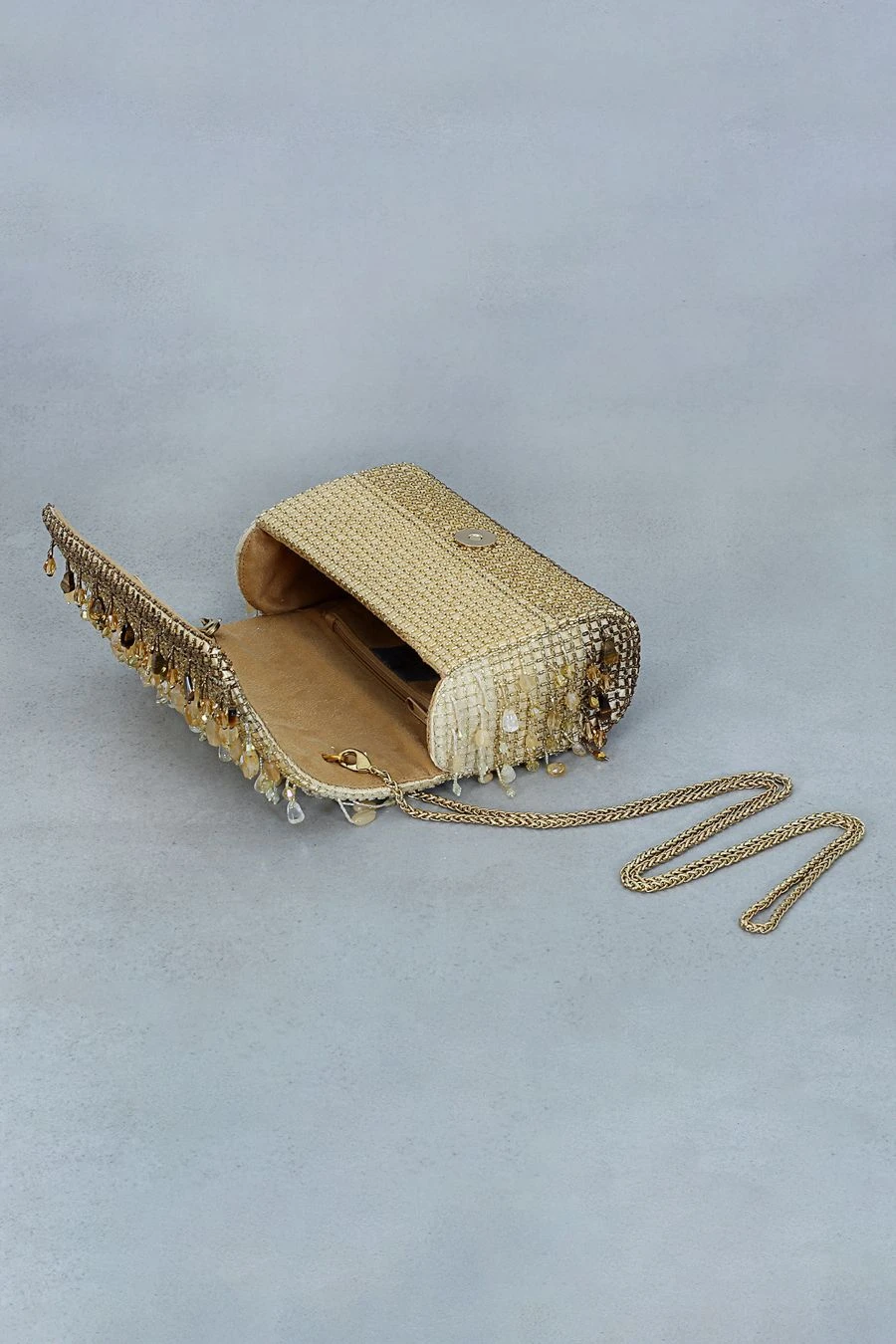 This bejewelled clutch is decadently hand embroidered with lustrous semi precious gems, Japanese micro beads & crystals in an ombre pattern. It comes with a hand embellished handle & a long chain, to style it with both modern & traditional outfits.