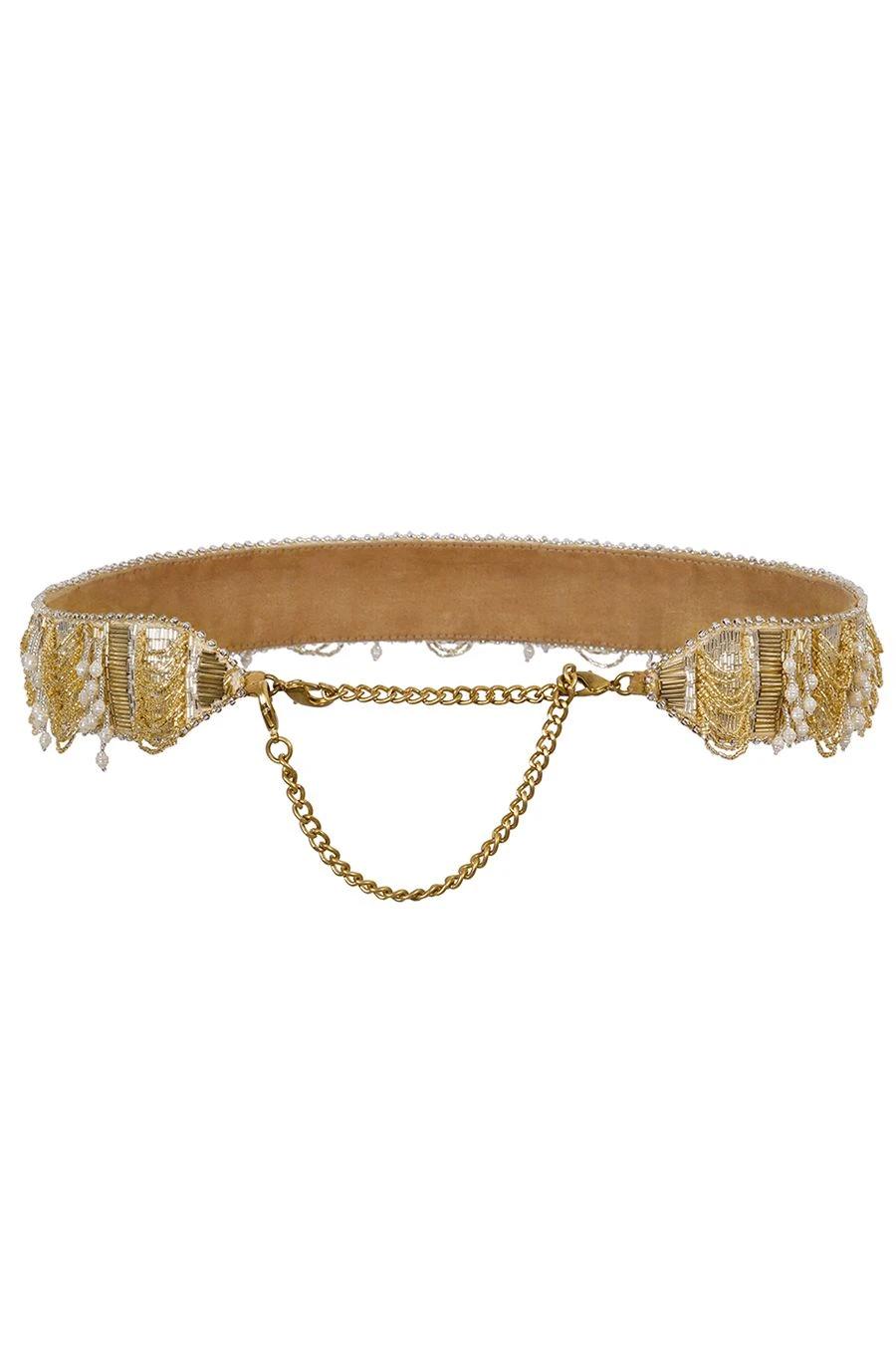 The ruche waist belt black is hand embroidered in a pave application with luminous silver and nocturnal black Japanese micro beads and baroque pearls. The surface of this belt is embellished with ornamental scallop tassels & baroque fringes.