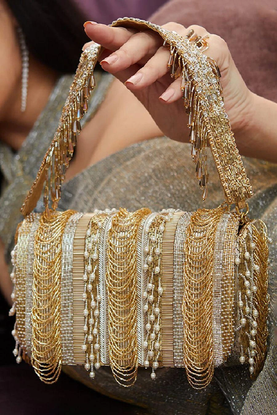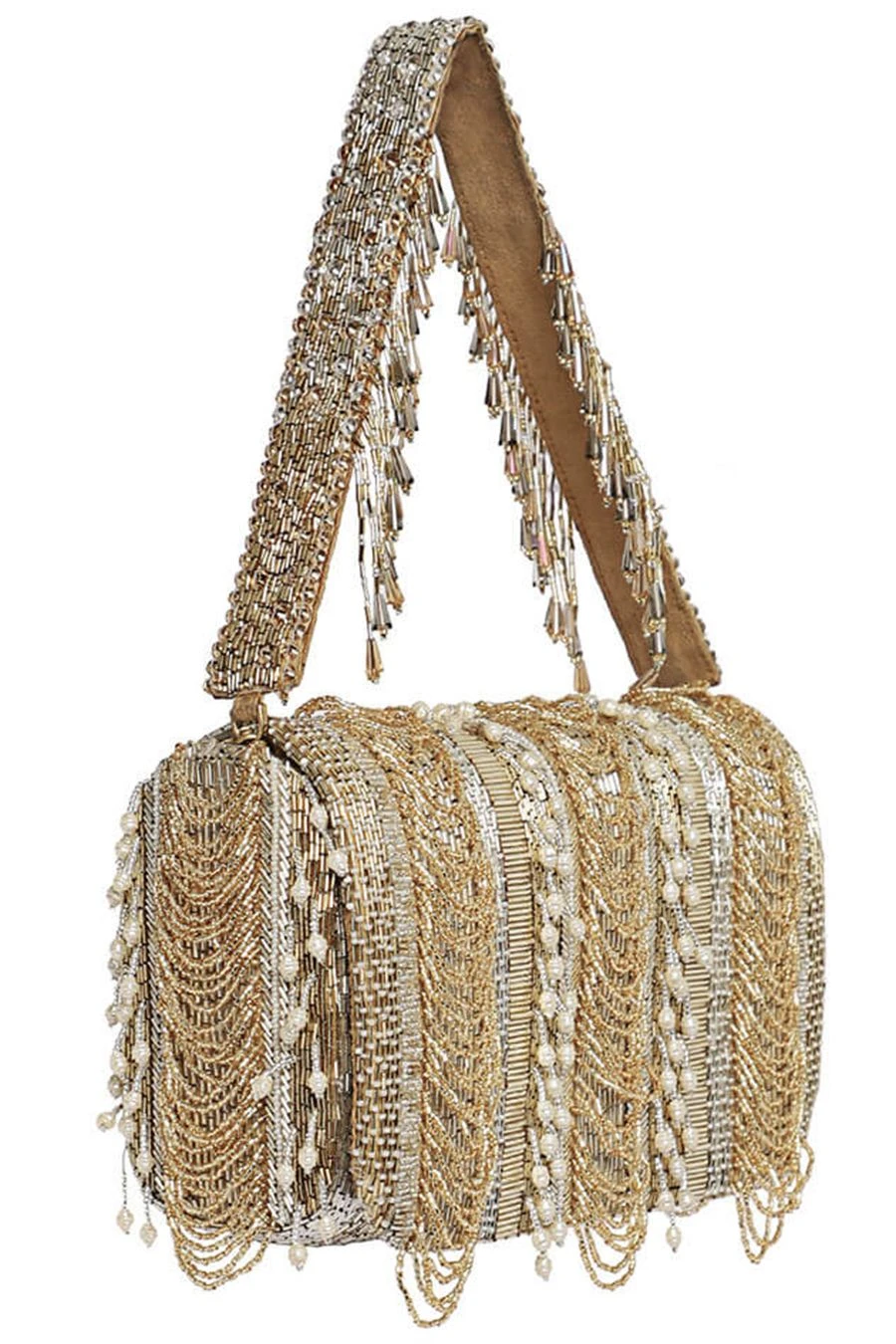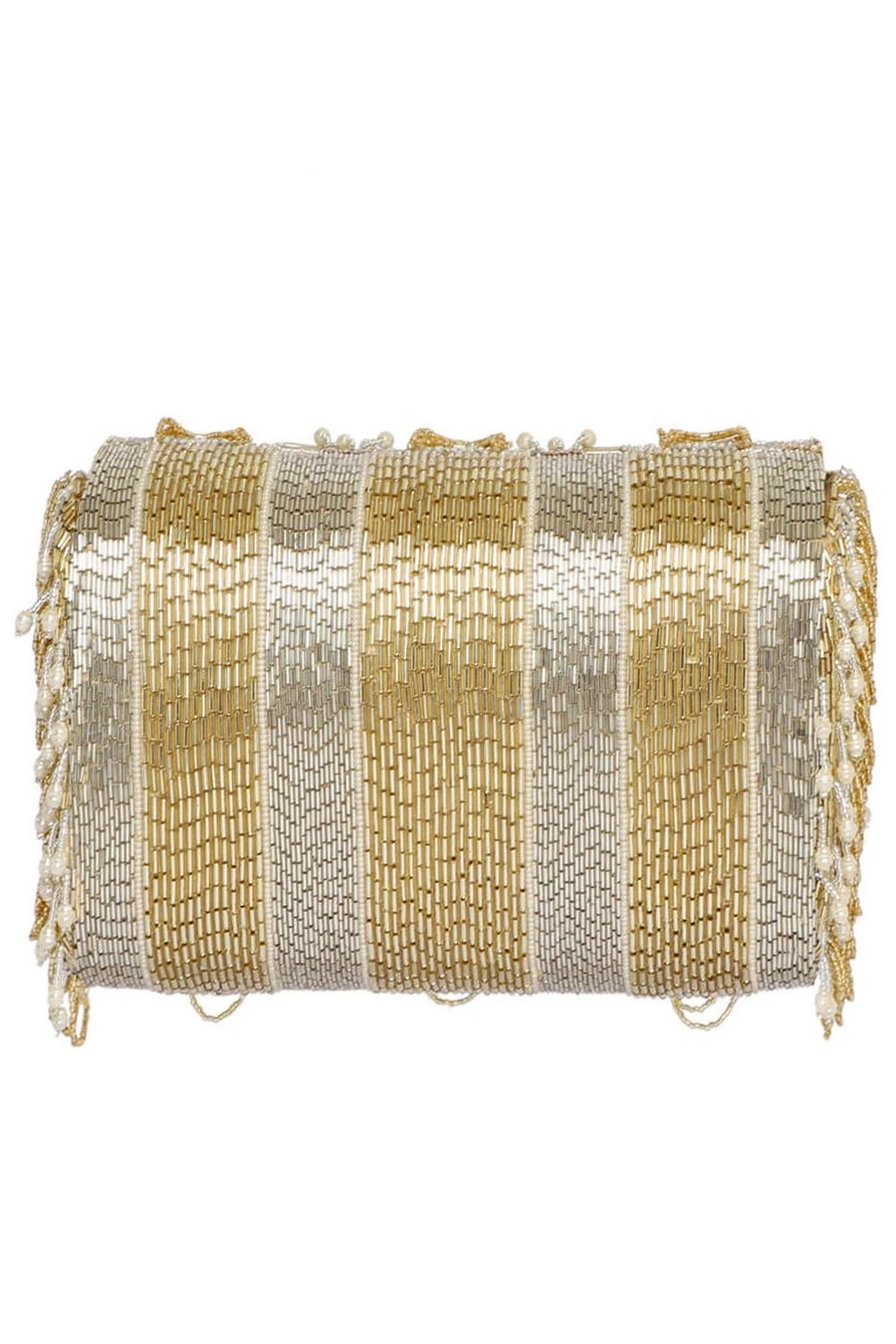 This flapover clutch is sumptuously hand embroidered with luminous Japanese micro beads & baroque pearls in a pave application. Ornamental scallop tassels & baroque fringes adorn the front & nonchalant stripes dress the reverse side of the clutch.