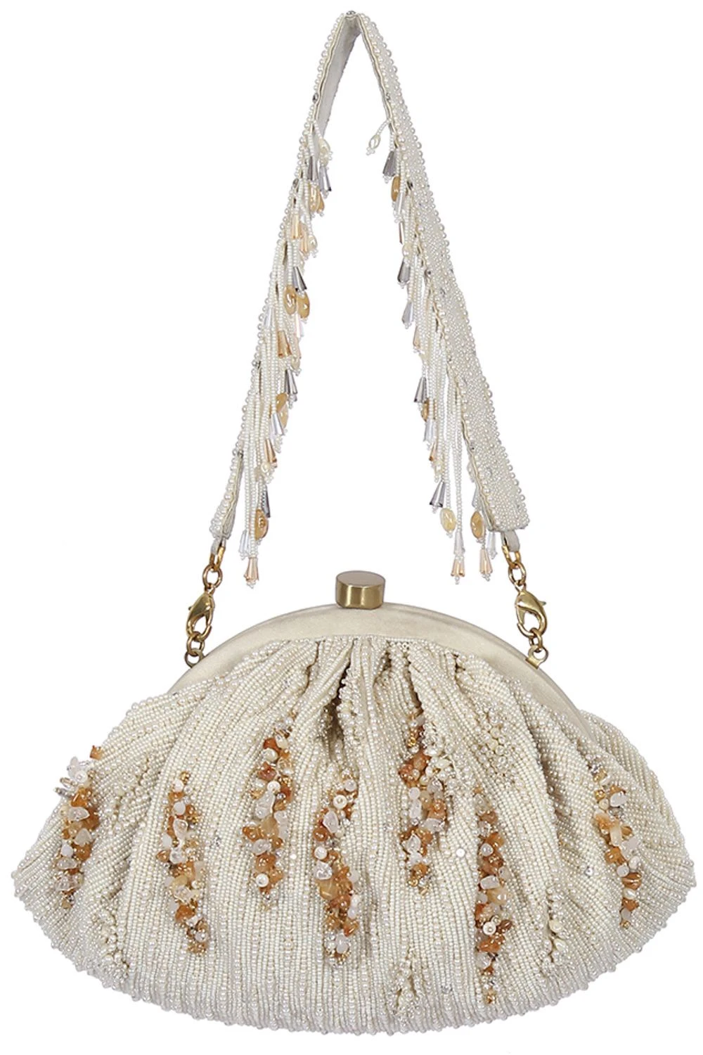 This ivory clutch features an assortment of quartz hued stones, nuggets, cultured pearls and iridescent crystals arranged in an abstract form over a pearlesque ivory base. The addition of an embellished handle makes it a statement accessory.