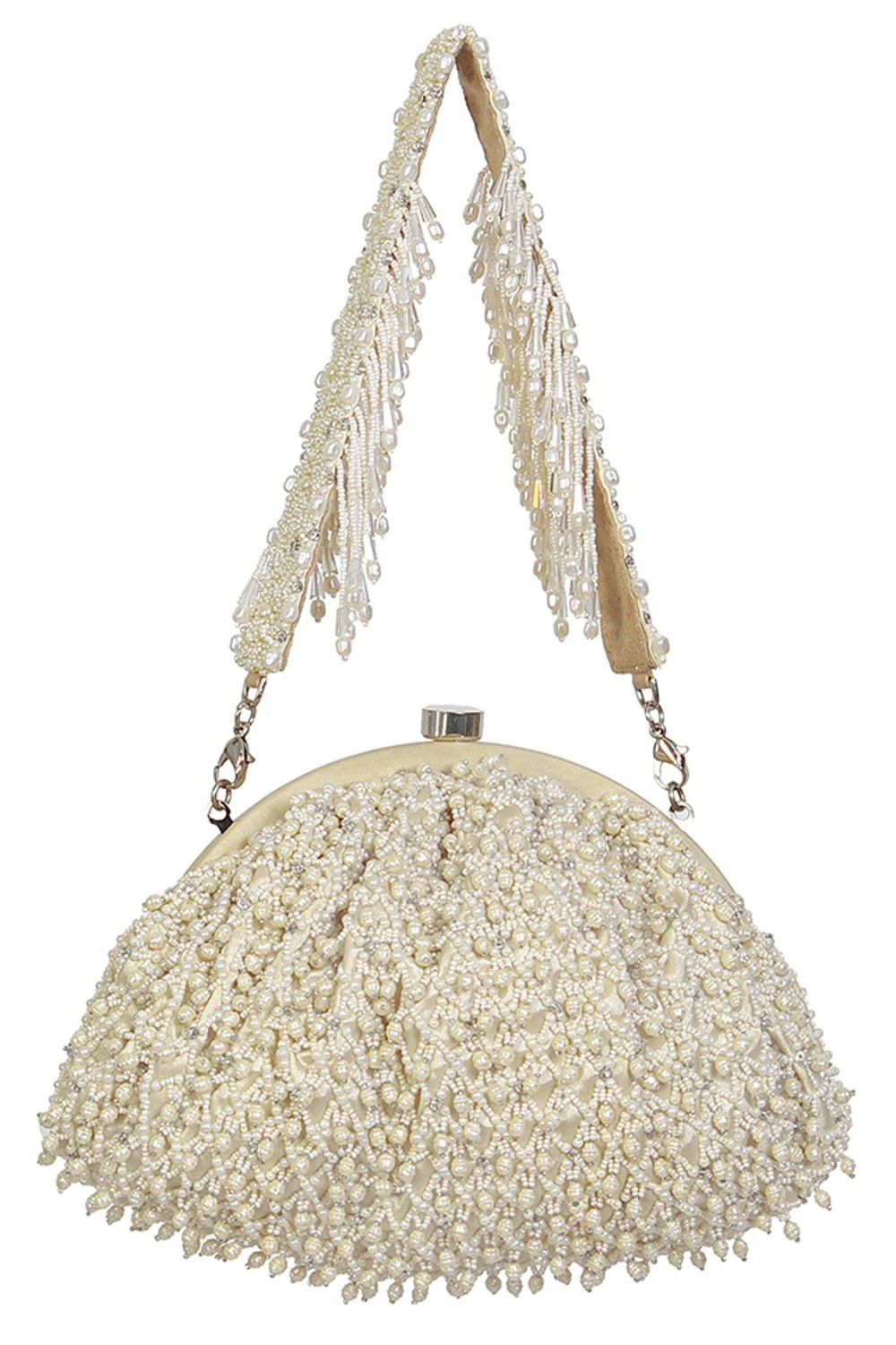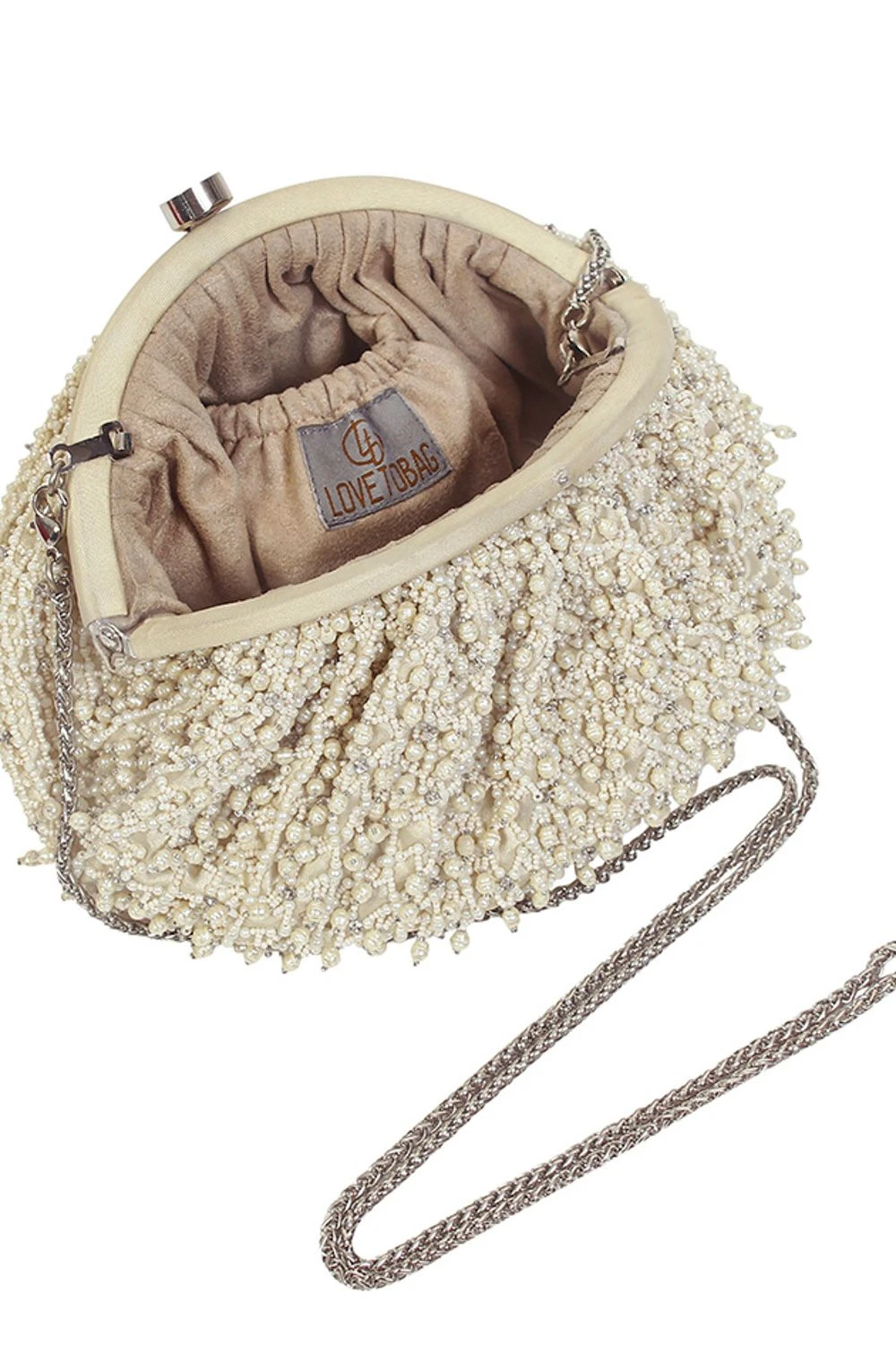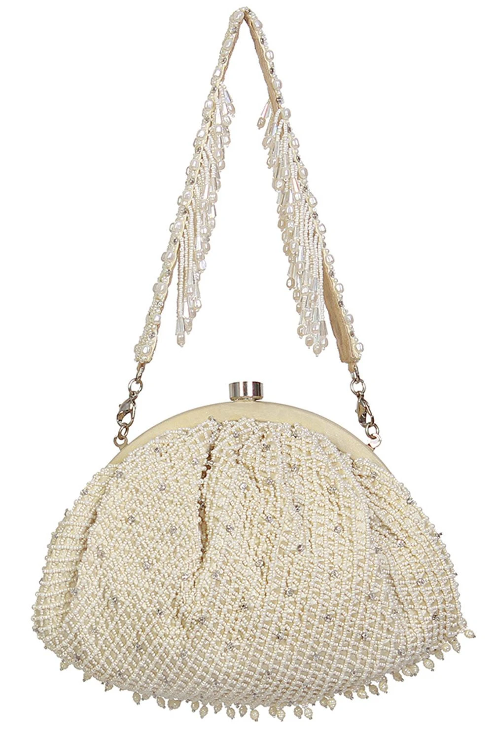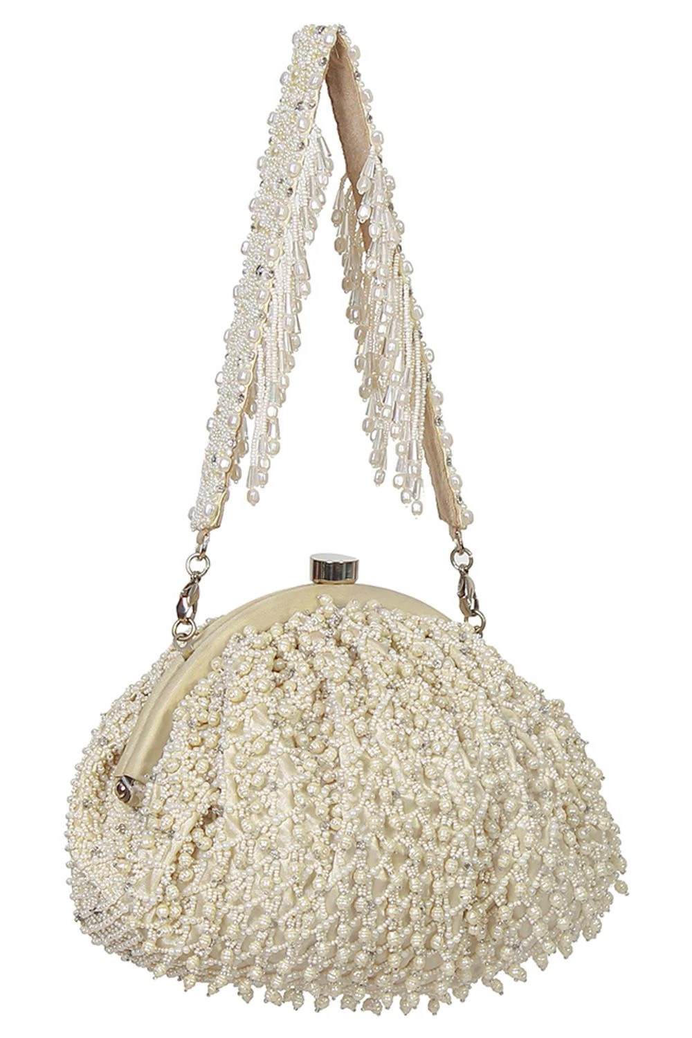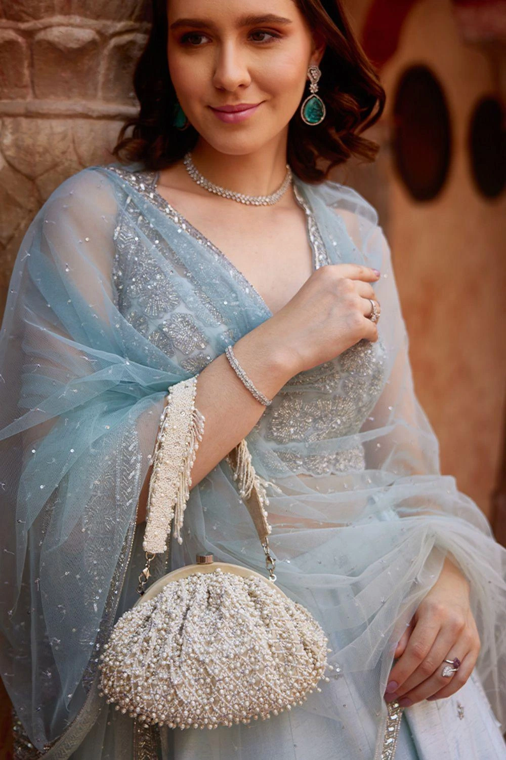 The Joel bag pays homage to heritage jaali work, capturing its mysterious play of light and shadow through intricate pearl and beadwork. Faceted crystal drops enhance its graceful demeanour.