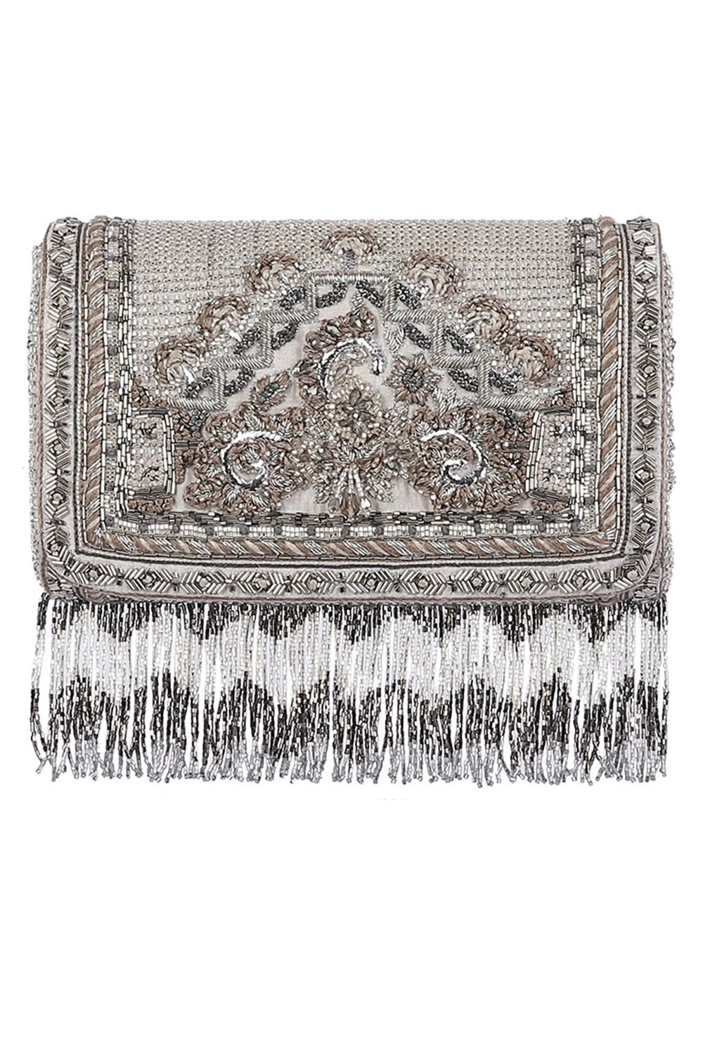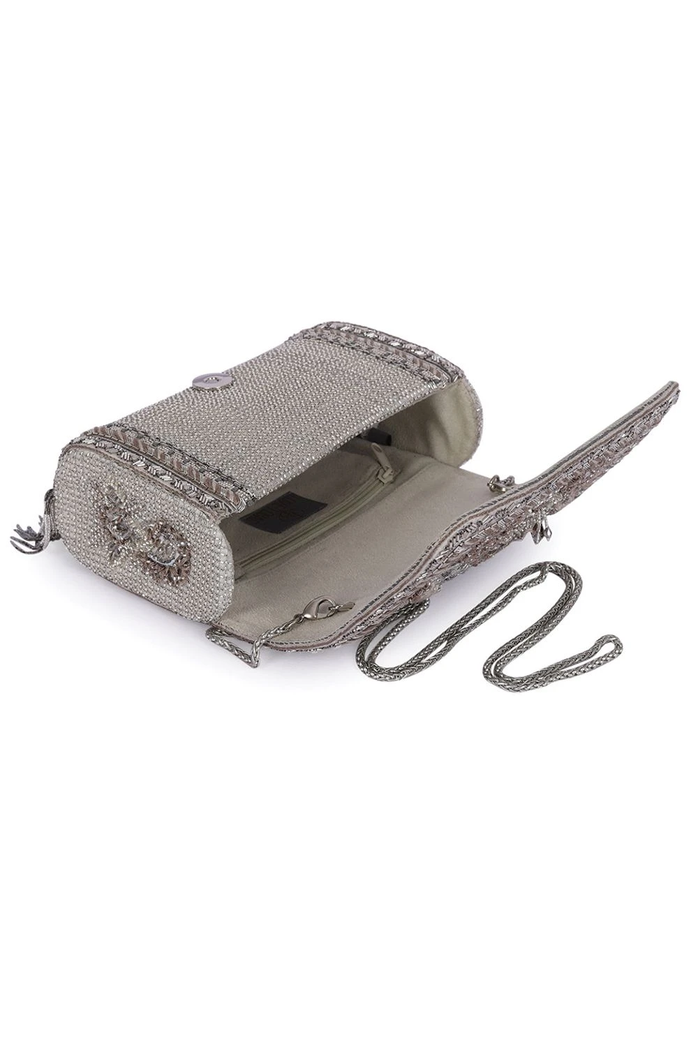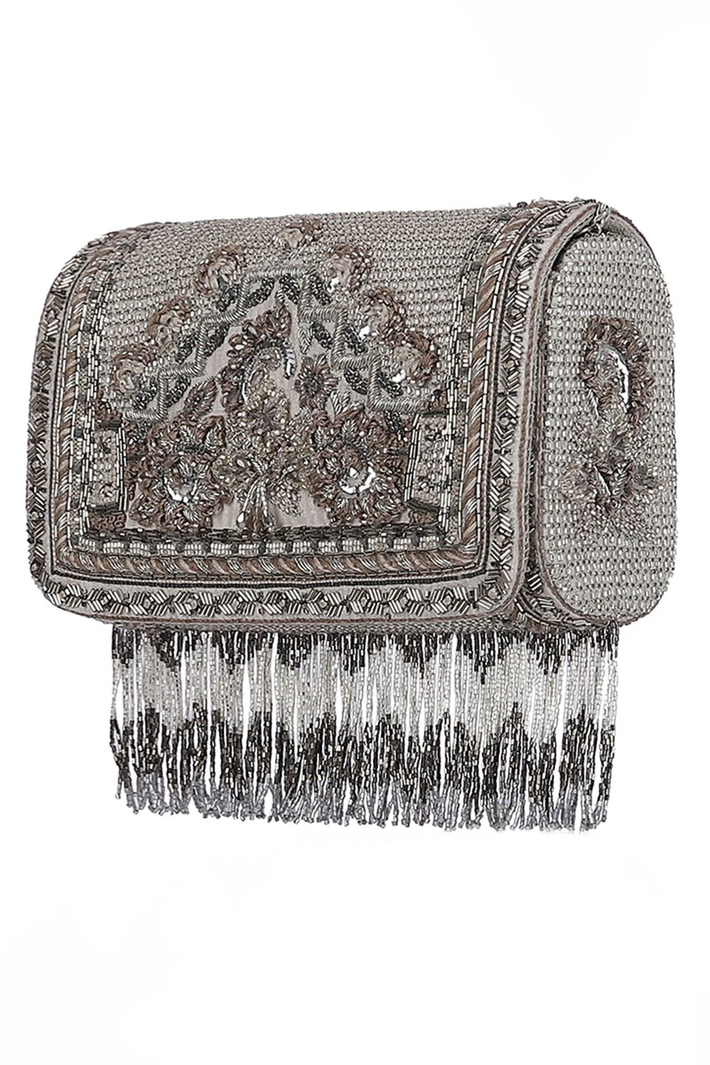 This flapover clutch is hand embroidered with Japanese micro beads & glass crystals. Set in a sublime handbeaded mesh, a floral motif adorns the front & chevron patterns dress the back. It has zardosi zig zag tassels & a detachable chain handle.
