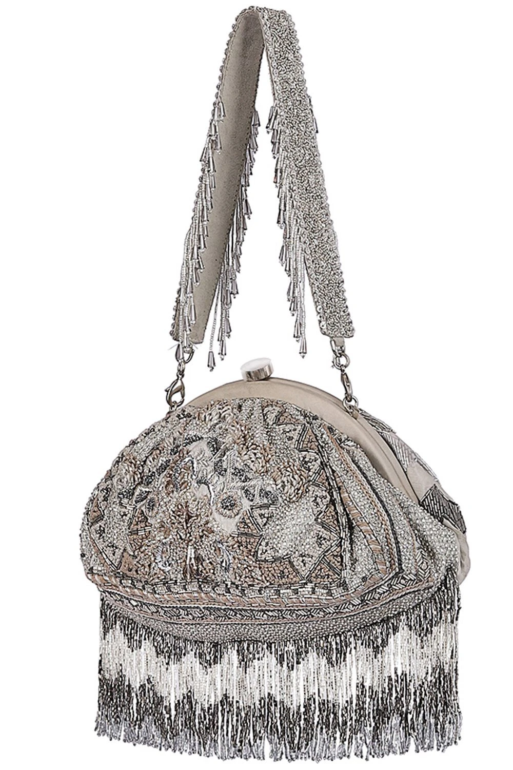 This pouch is hand embroidered with Japanese micro beads & glass crystals. Set in a sublime handbeaded mesh, a floral motif adorns the front while chevron patterns dress the back. It has exquisite zardosi zig zag tassels & a chain handle.