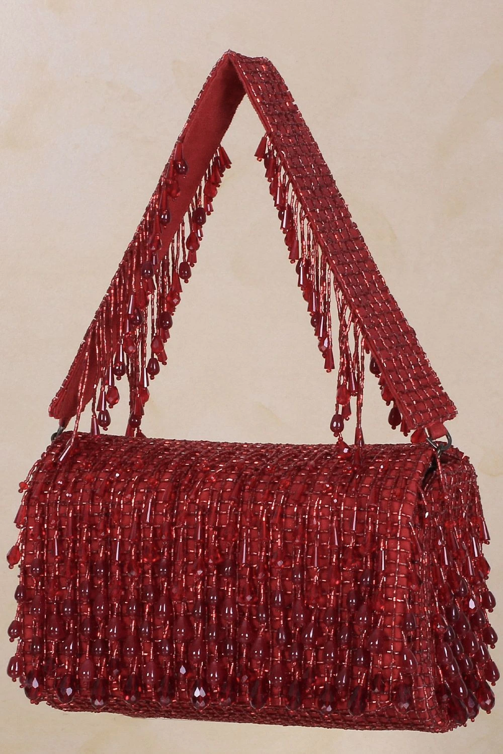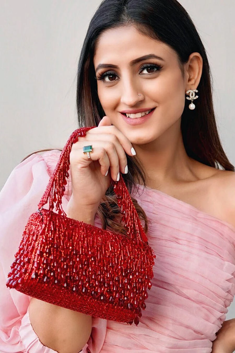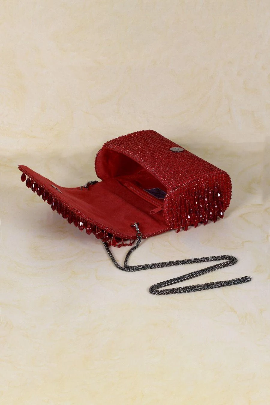 This bejewelled flapover clutch is decadently hand embroidered with an assortment of lustrous semi precious gems, Japanese micro beads & crystals in an ombre pattern. It comes with a matching hand embellished handle & a long chain.