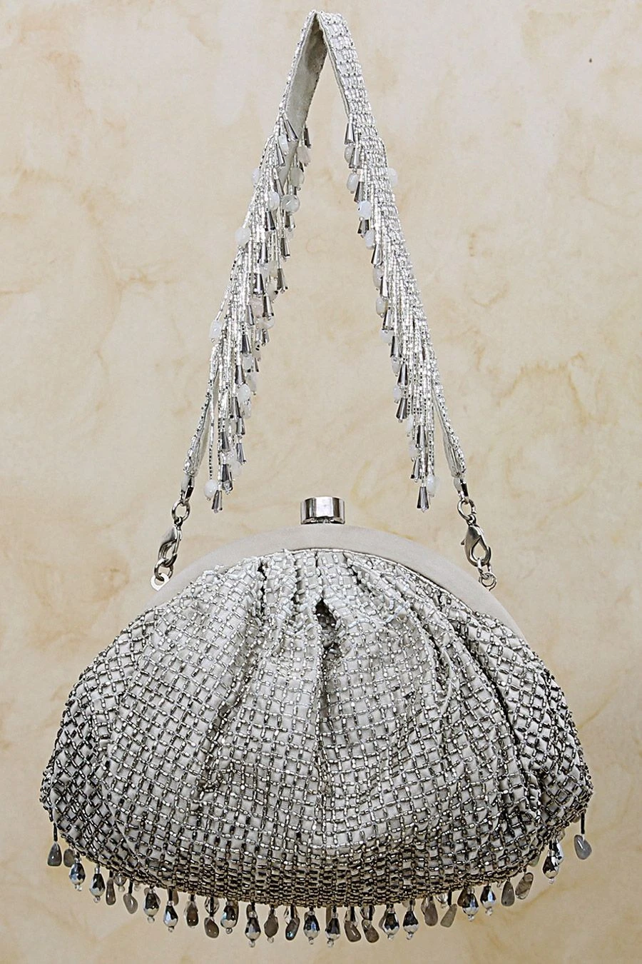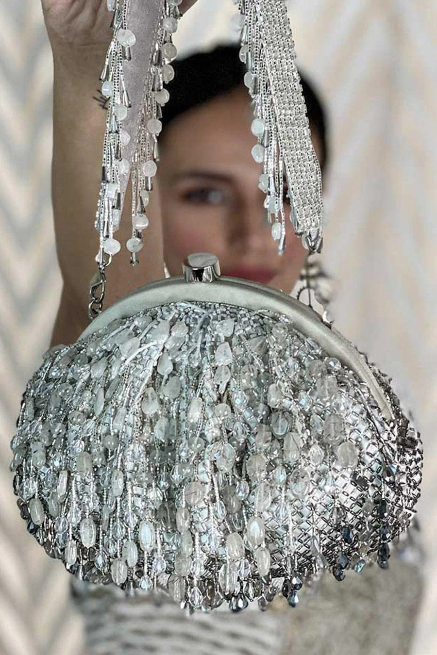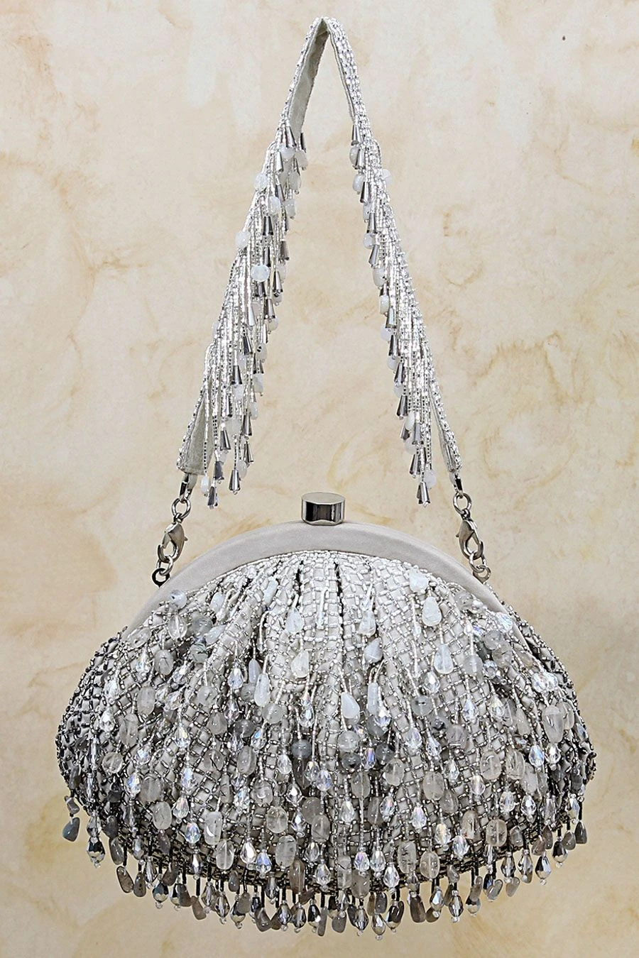 This bejewelled pouch is decadently hand embroidered with an assortment of lustrous semi precious gems, Japanese micro beads & crystals in an ombre pattern. The handle is hand embroidered with lustrous micro beads, crystals & diamante.