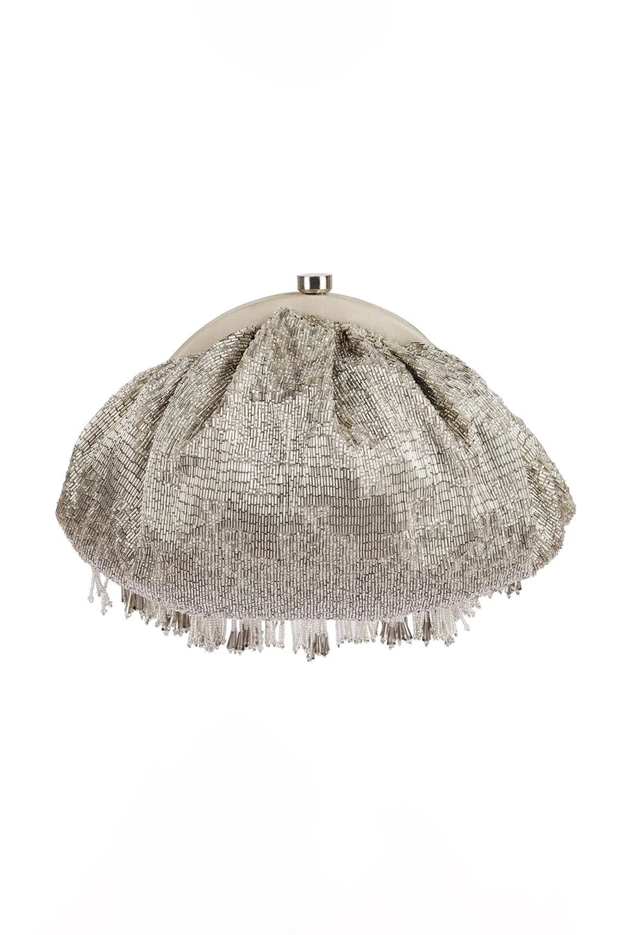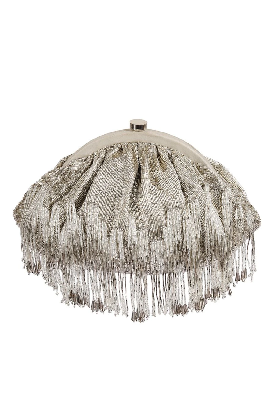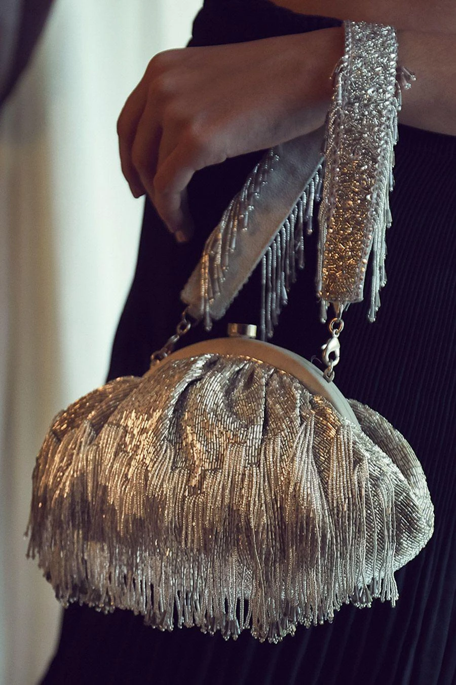This ritzy soft pouch is decadently hand embroidered with lustrous tinted crystals & Japanese micro beads. Aztec tassels adorn the fluid metallic embellishment of the front side whereas a subtle geometric pattern dresses the reverse side.
