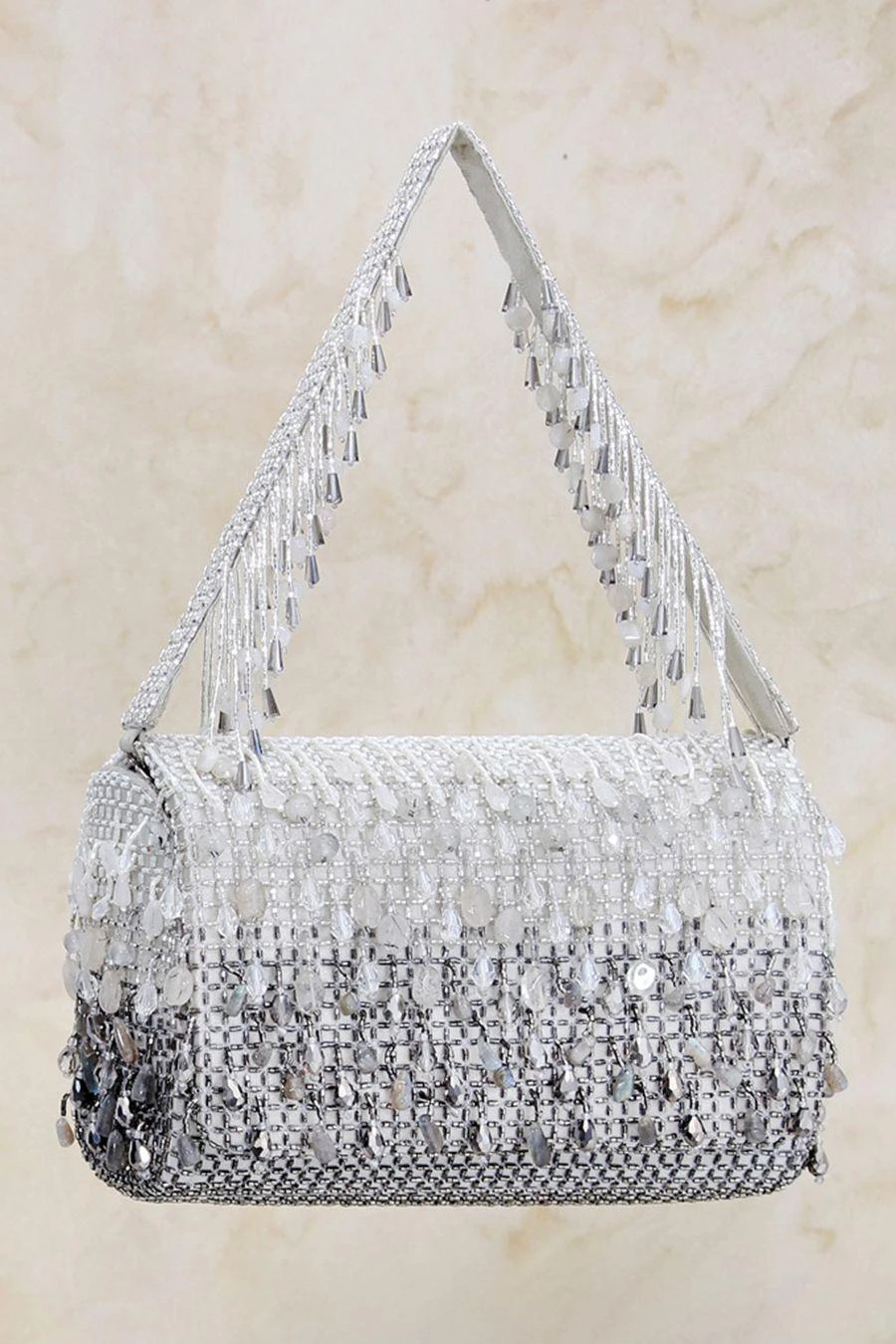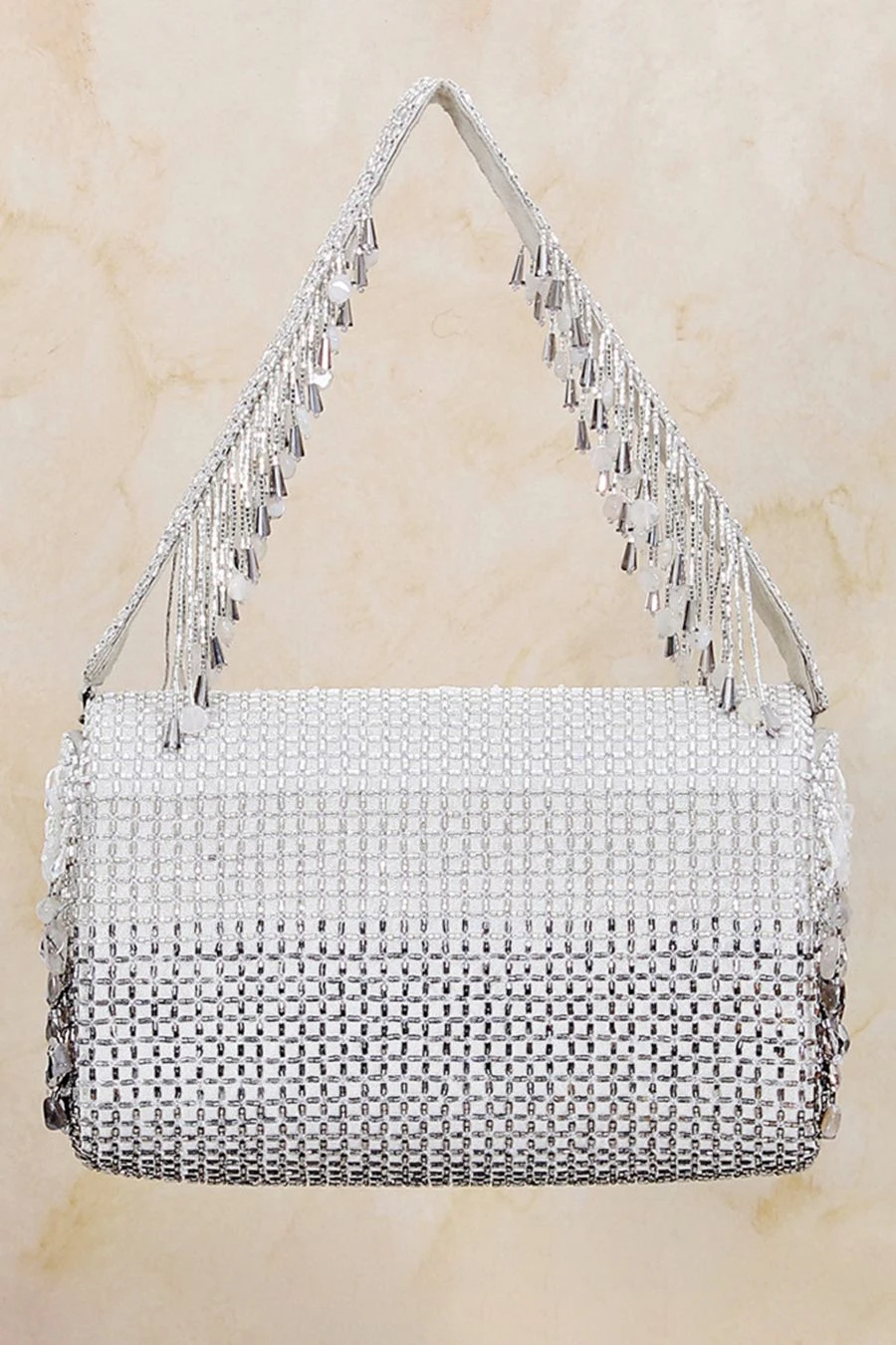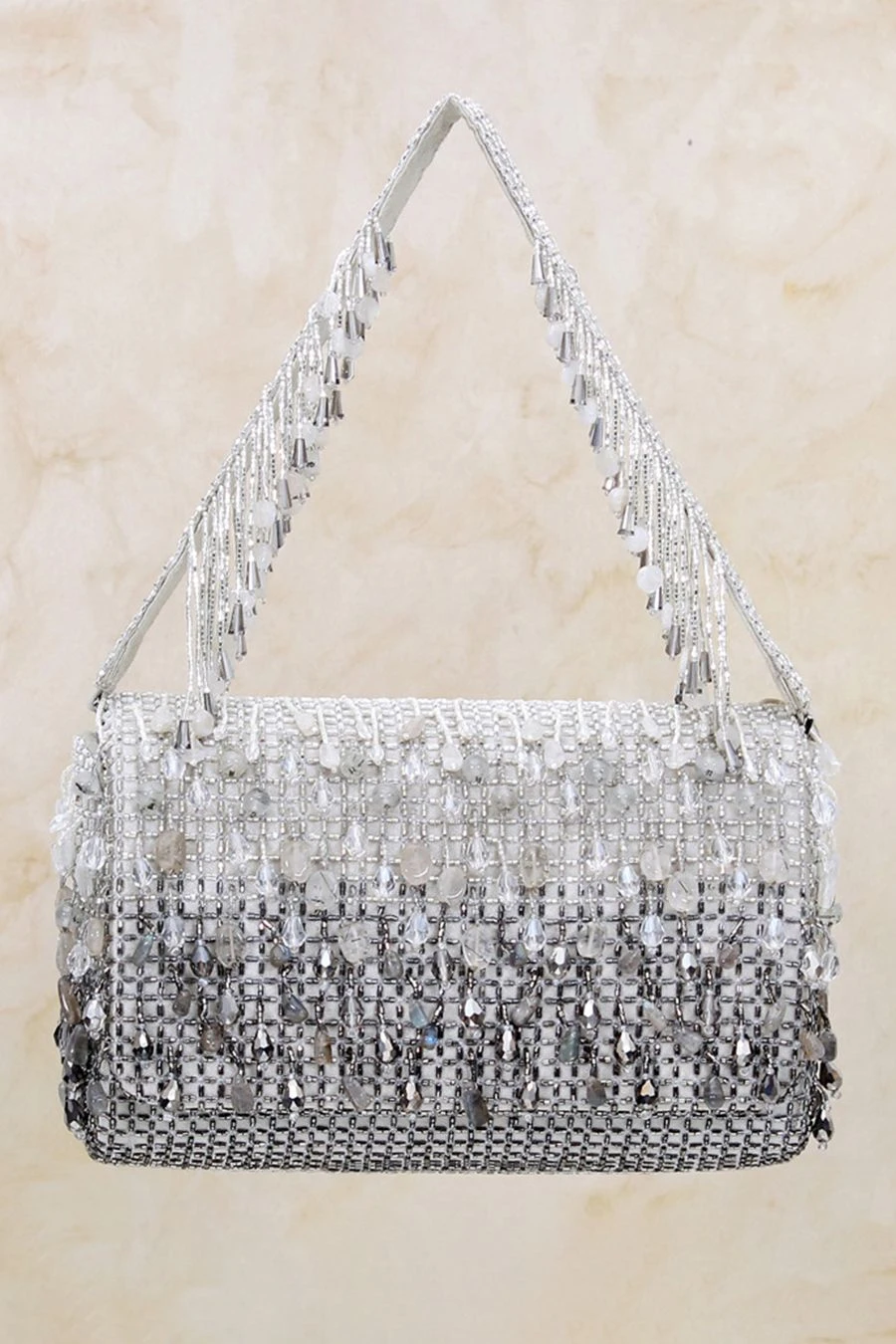 This bejewelled clutch is decadently hand embroidered with lustrous semi precious gems, Japanese micro beads & crystals in an ombre pattern. It comes with a hand embellished handle & a long chain, to style it with both modern & traditional outfits.