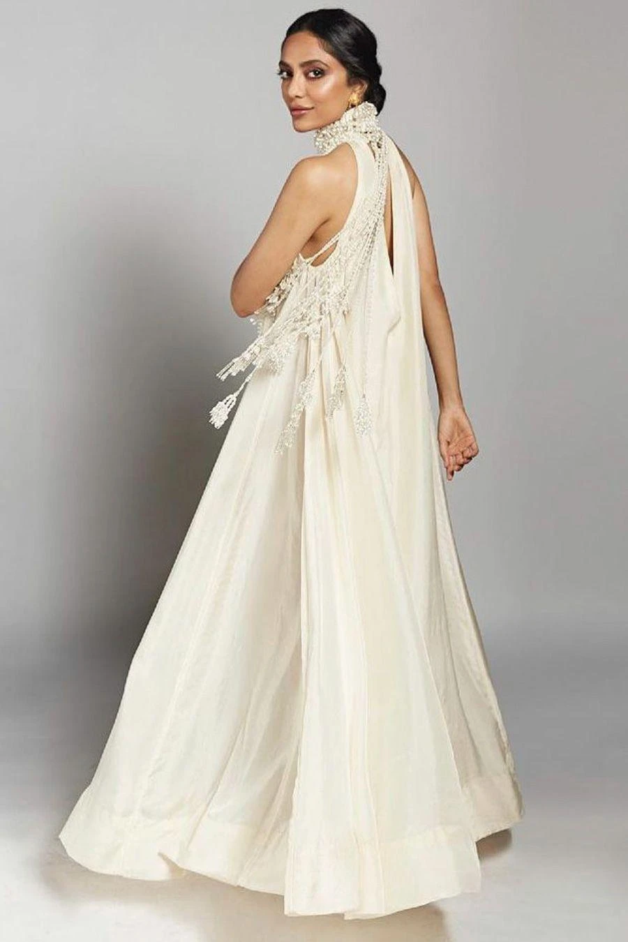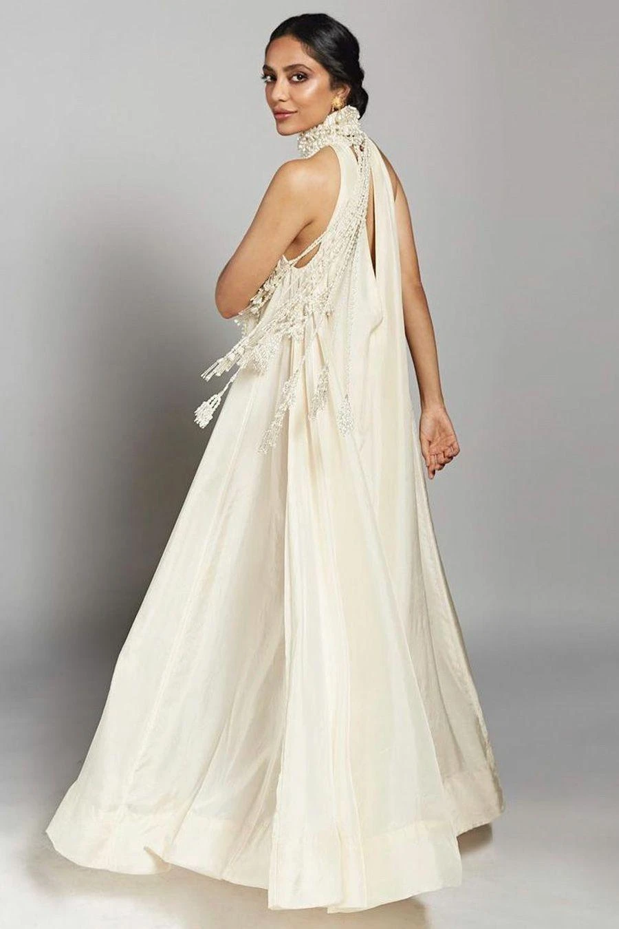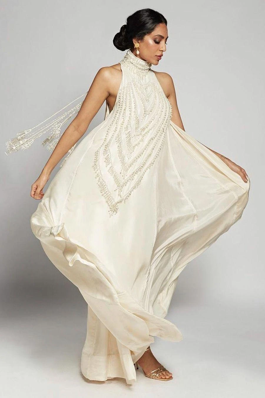 If you’re looking for a head-turning statement-making gown that isn’t too heavy, this is the dress for you. Crafted in habutai silk, this hand embellished gown comes with a pearl choker.