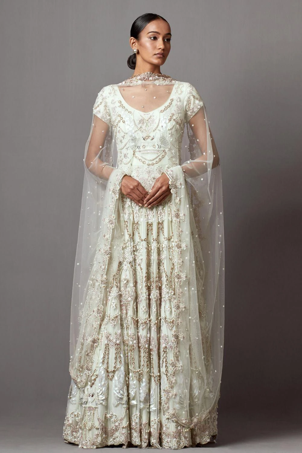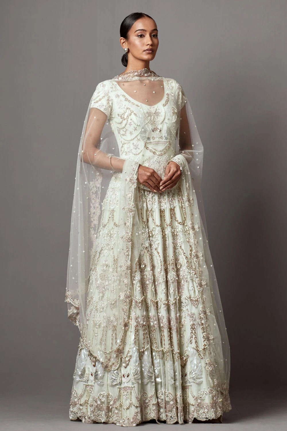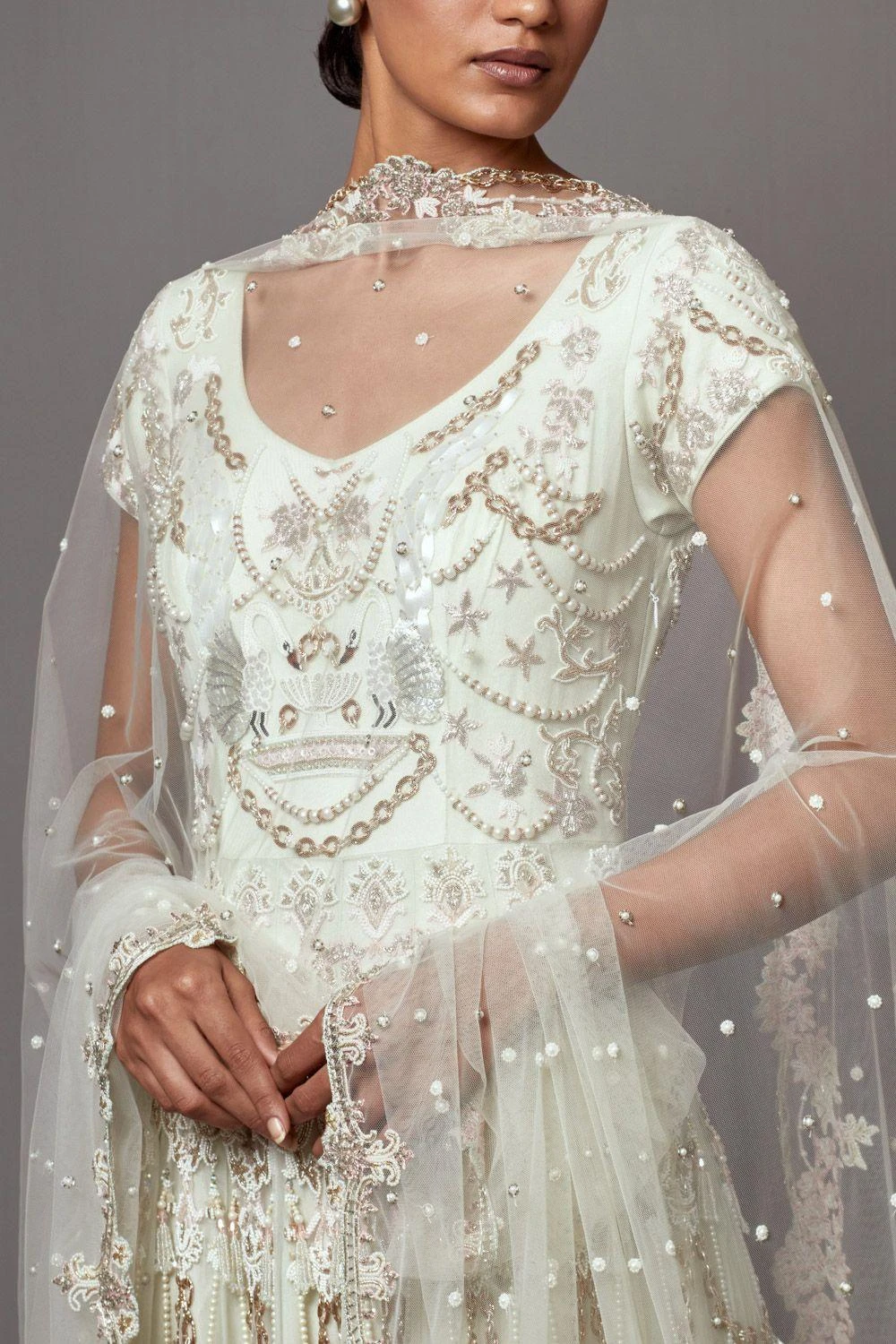 Step into an era of grandeur with the Baroque-inspired Anarkali. Hand-embroidered pearls, beads & zardosi intricately adorn this regal ensemble. The cutwork bottom and scallop dupatta add a touch of royal finesse. Elevate your style, embrace luxury.
