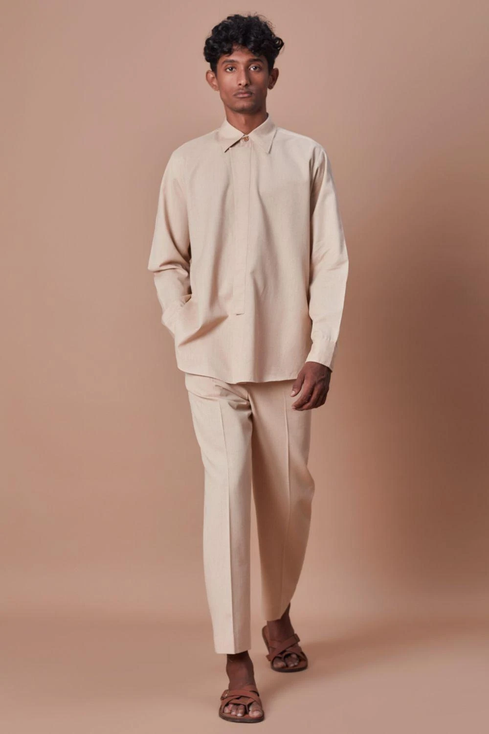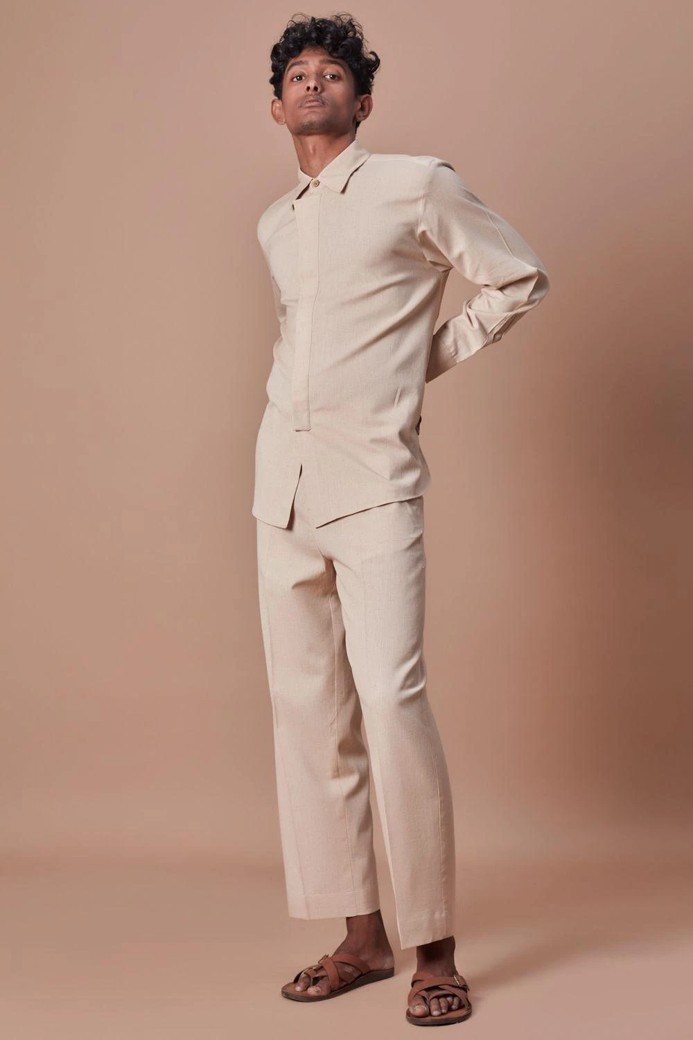 This dapper beige placket shirt & ankle pant set is perfect for daytime events. Set in a luxe handwoven cotton fabric this piece can be worn as a set or separates with equal ease.