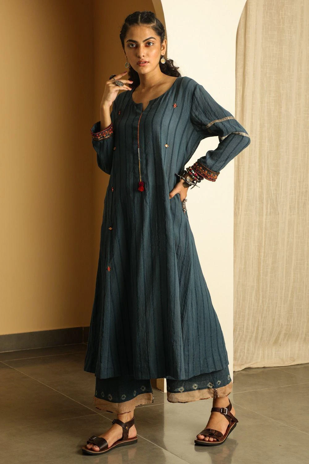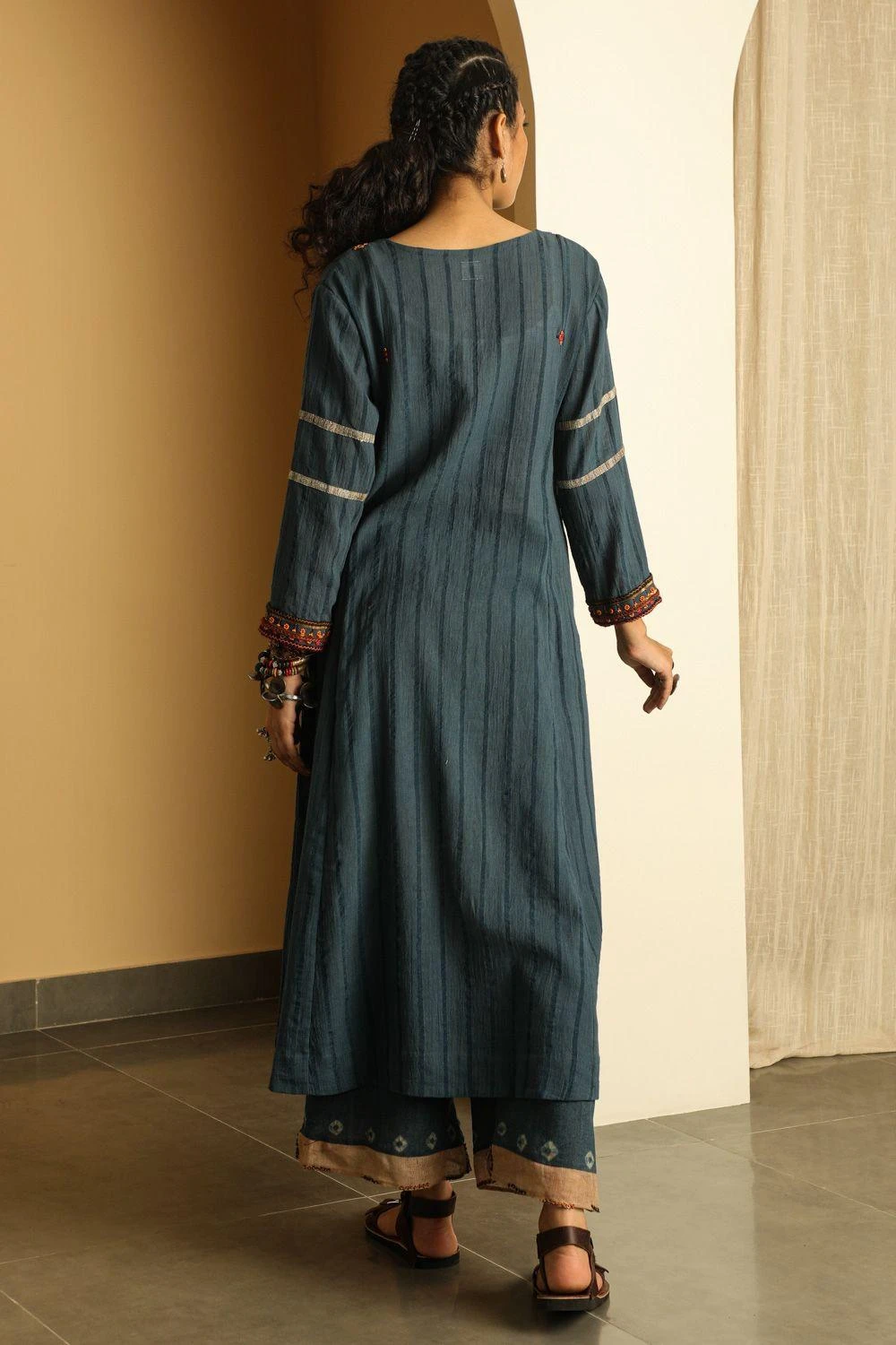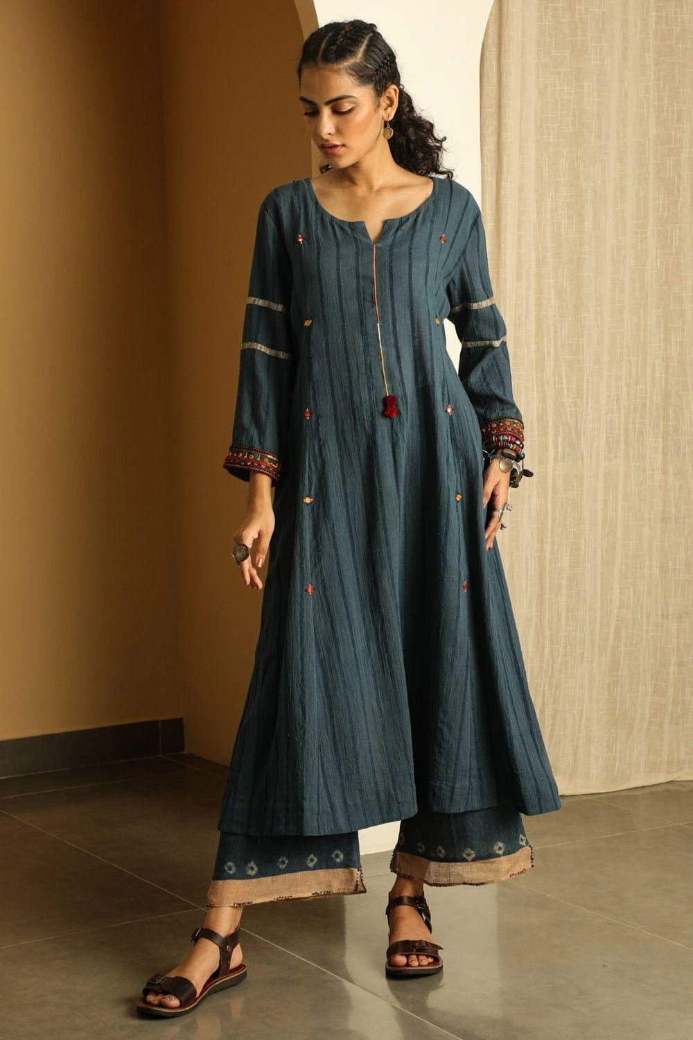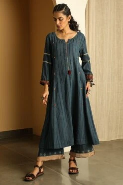 Amp up your ethnic closet with this minimal & understated blue kurta. It is woven in striped cotton and enhanced with hand embroidery on the front placket, mirror work and herringbone patti detail. Style this piece with palazzo pants and a scarf.