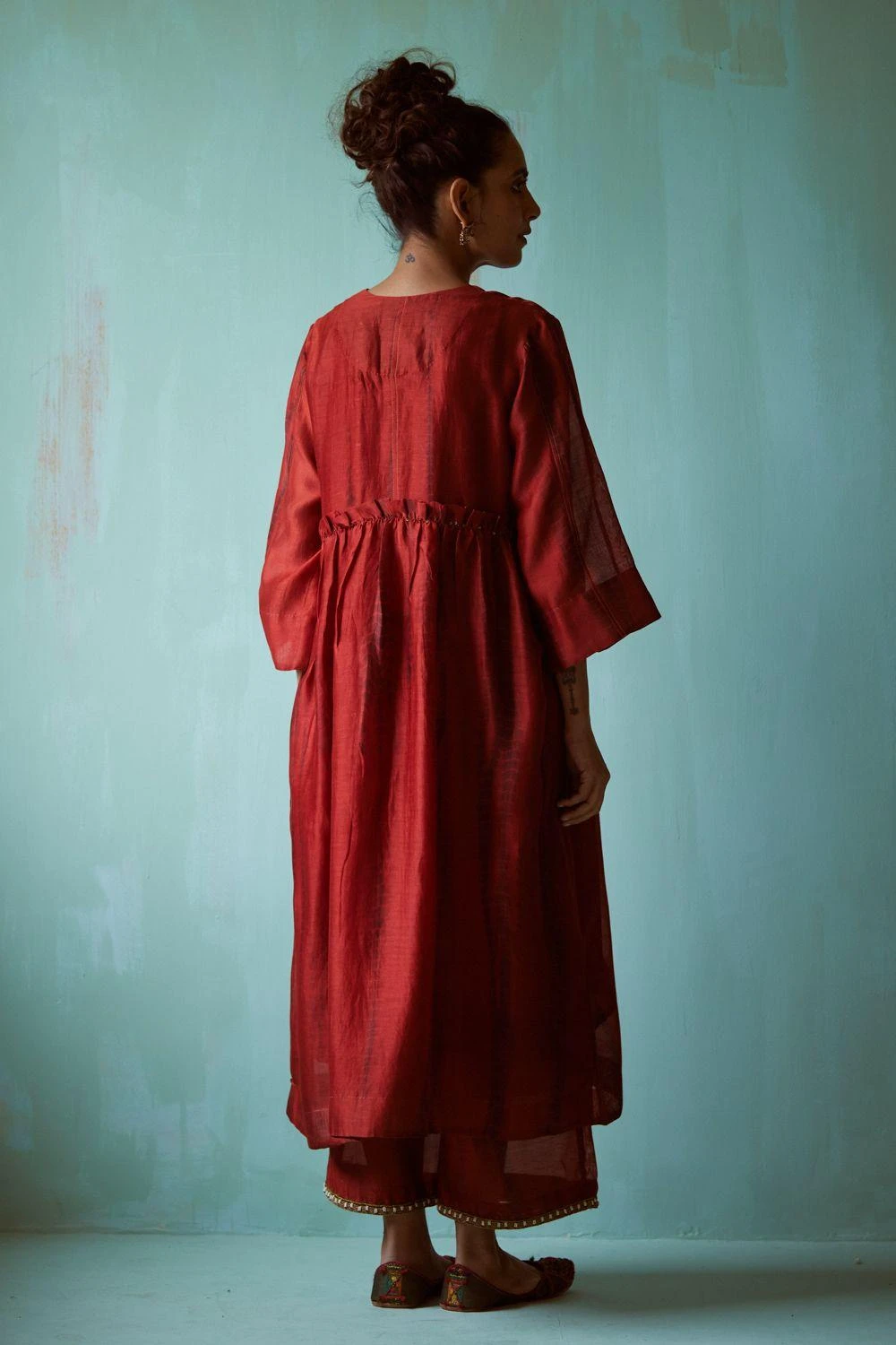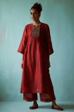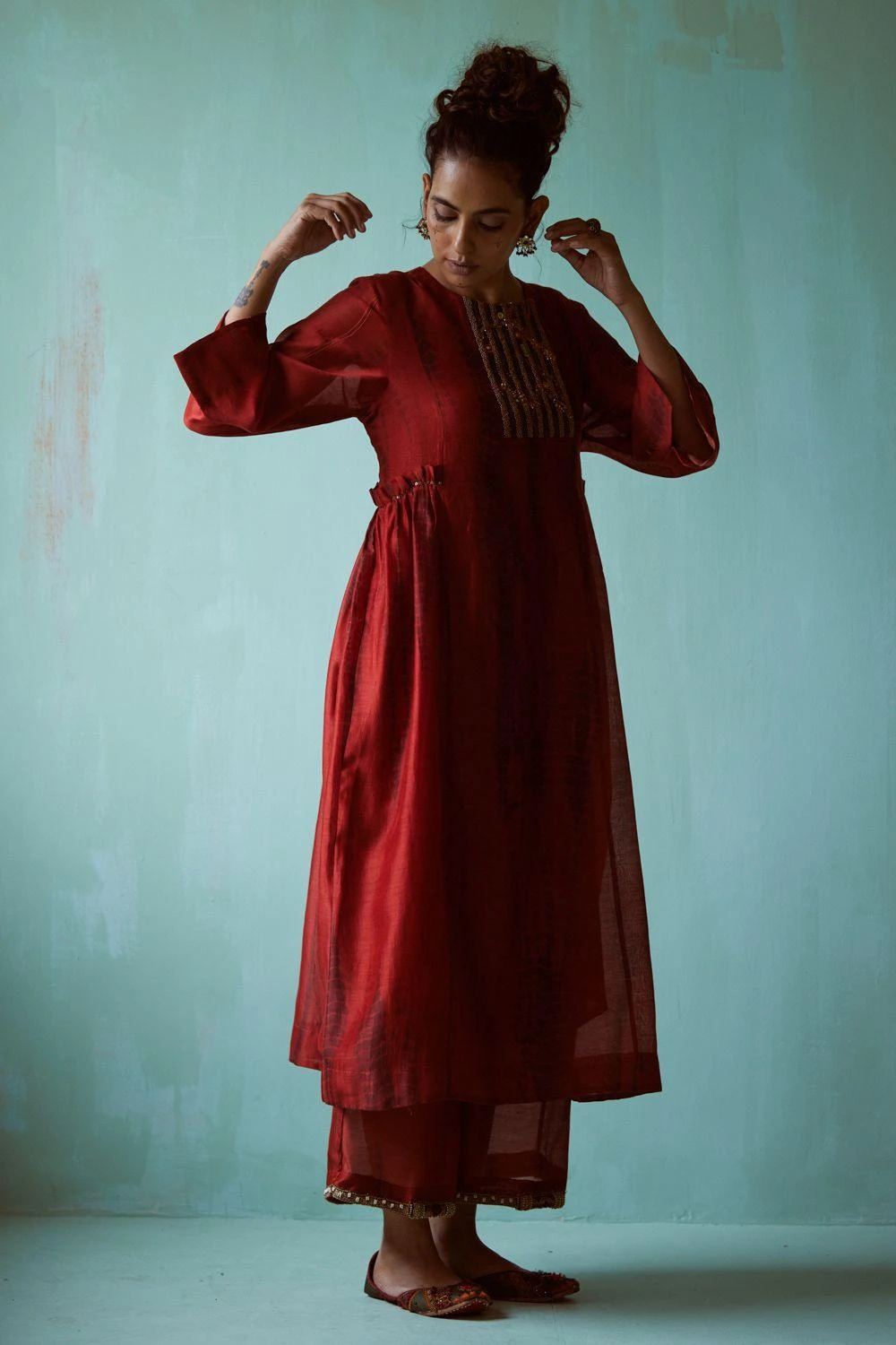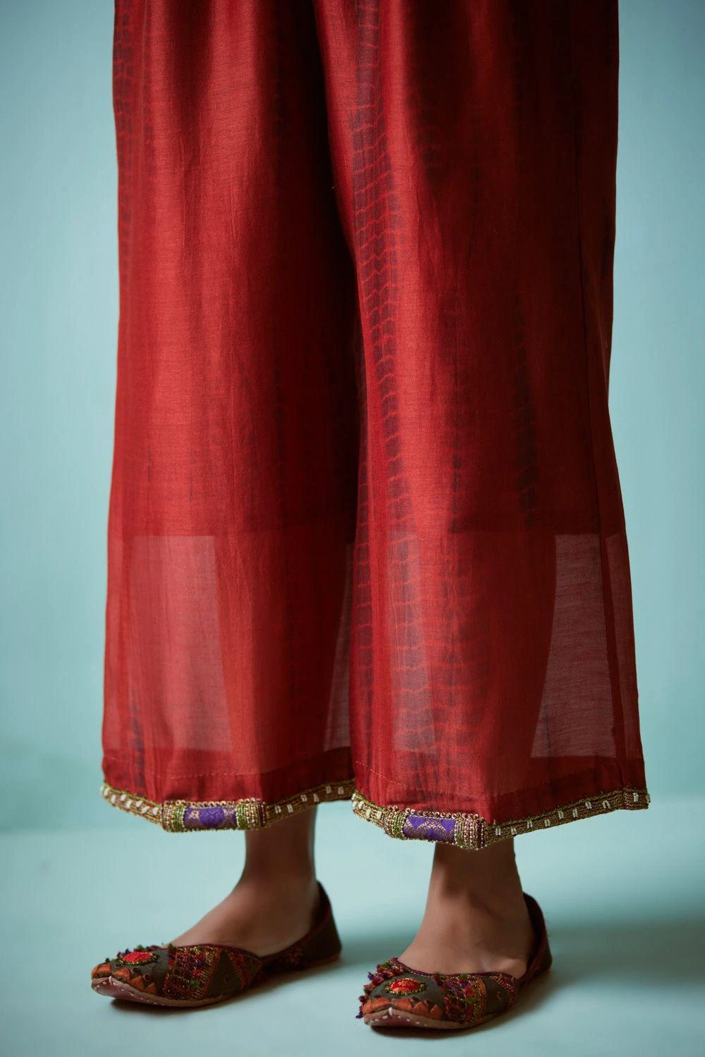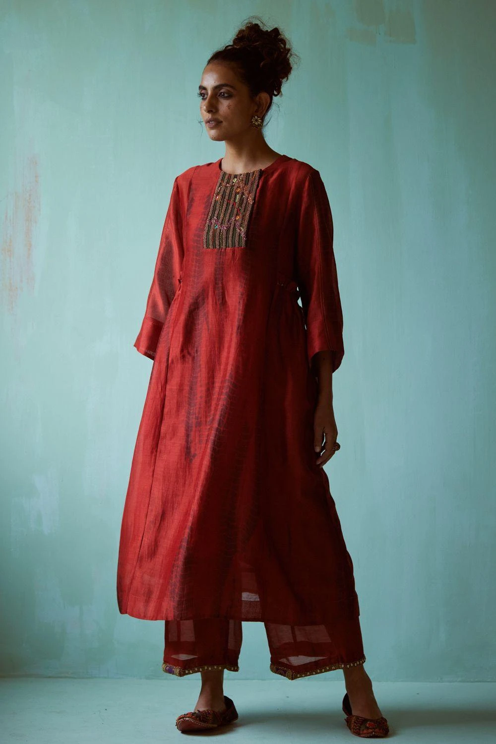 Look effortlessly stylish with this tunic set. Crafted in chanderi, this set features a tie & dye tunic with hand embellishments paired with coordinating pants. Add a pair of dangler earrings to complete the look.