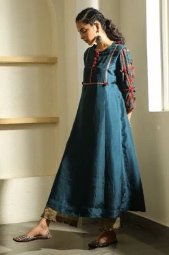 These translucent sage green pants are made in tissue kota and accented with handmade potli buttons made from scrap fabric at the hem. These pants will add a fun element to your look.