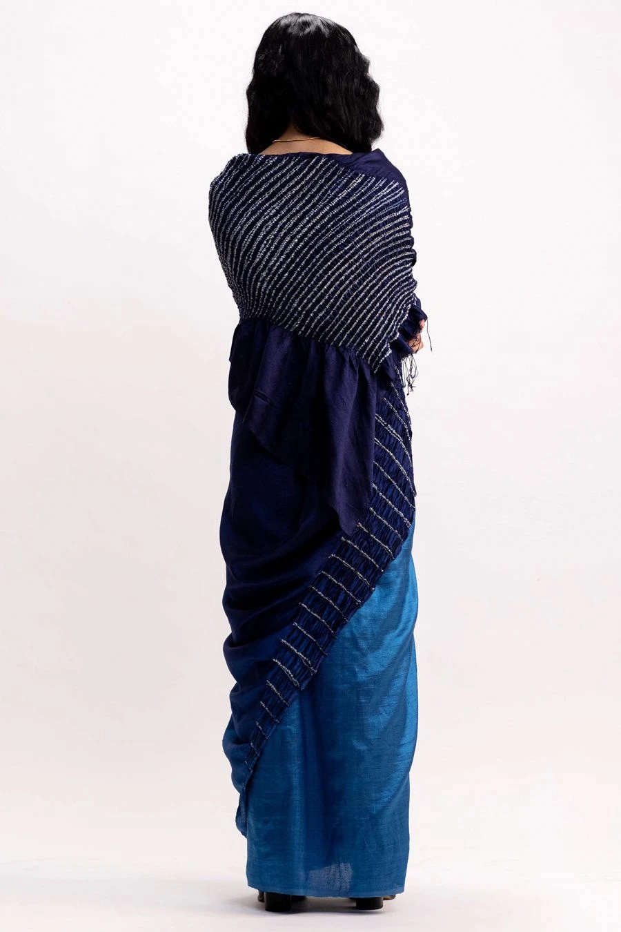 Taking inspiration from the works of Itchiku Kubota & Jeremy Gardiner, this collection rediscovers the six yard drape as a canvas & reimagines it as a second skin. Engineered in Jamdani & Bandhani this sari comes with an unstitched blouse piece.