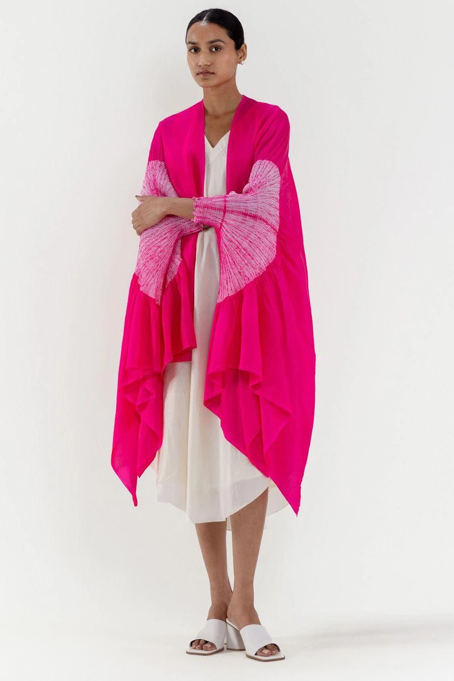 Make a fashion statement with this cape, featuring a shibori sleeve in a shade of fuchsia. Whether draped over your shoulders at a special event or worn as a chic layering piece, this cape is sure to make you feel like a true fashion icon.