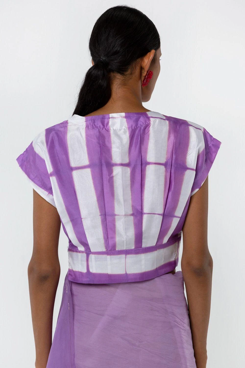 This hand woven silk V-neck blouse in a white base, will perfectly compliment your understated saris. It features an itajime shibori pattern hand-dyed in lavender.