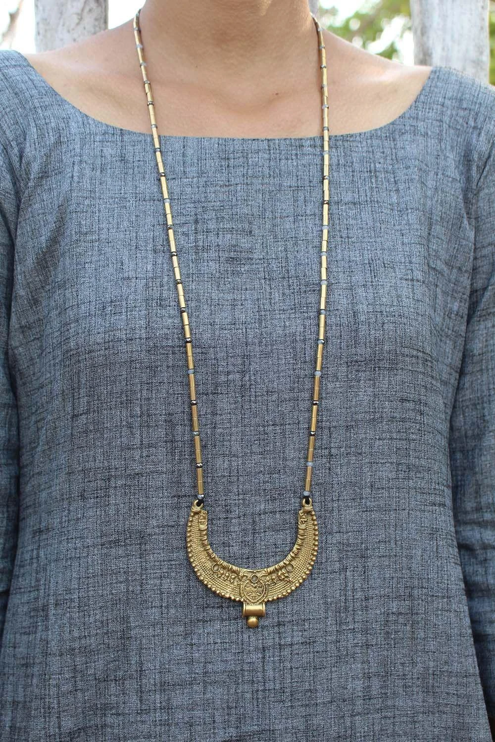 This elegant handcrafted ethnic brass pendant necklace can be styled beautifully with Indian looks. Style this piece with an elegant sari or tunic for an artsy look.