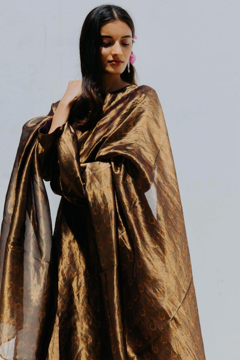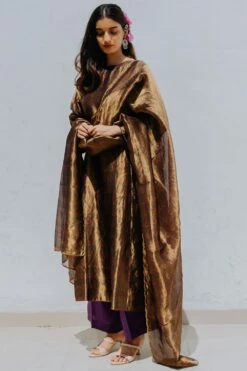 Mimasaa’s take on metallic is nothing but elegant & understated. Featuring an antique golden kalidar kurta set in printed tissue. It is paired with matching chanderi silk pants and tissue silk dupatta. Add a pair of statement studs with this look.