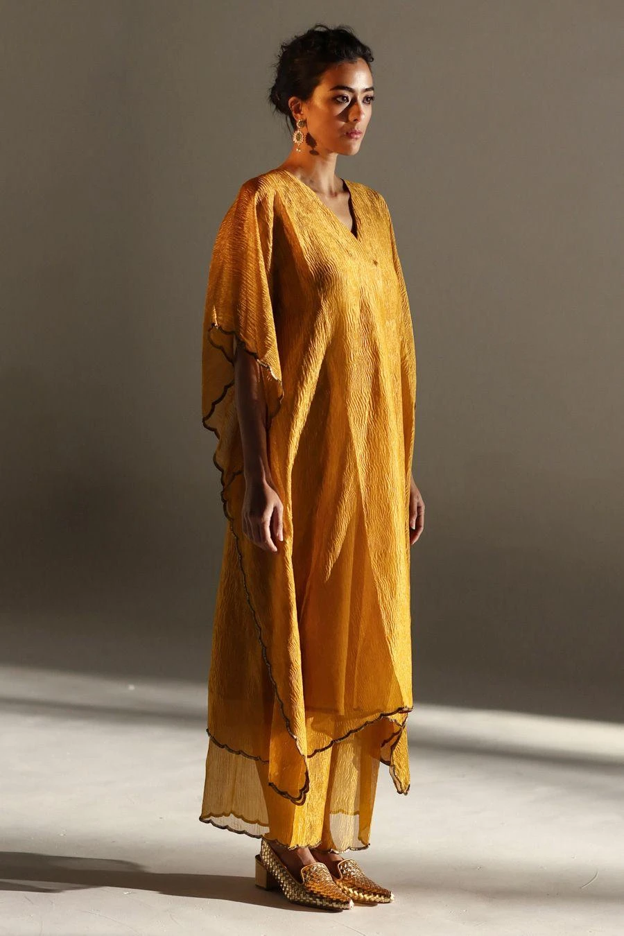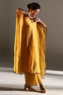 Indulge in Mimamsaas understated luxury & fine craftsmanship with this mustard yellow kaftan set. This kaftan & pants are woven, embroidered and hand crushed in rich tissue silk. This set is offset with an underdress.