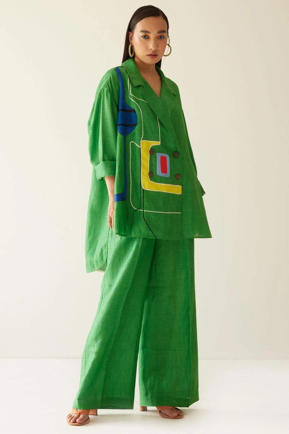 Experience the epitome of sophistication with this oversized linen blazer. Adorned with exquisite embroidery on the front, this statement piece exudes elegance. The jacket is paired with coordinating trousers for a polished & refined ensemble.