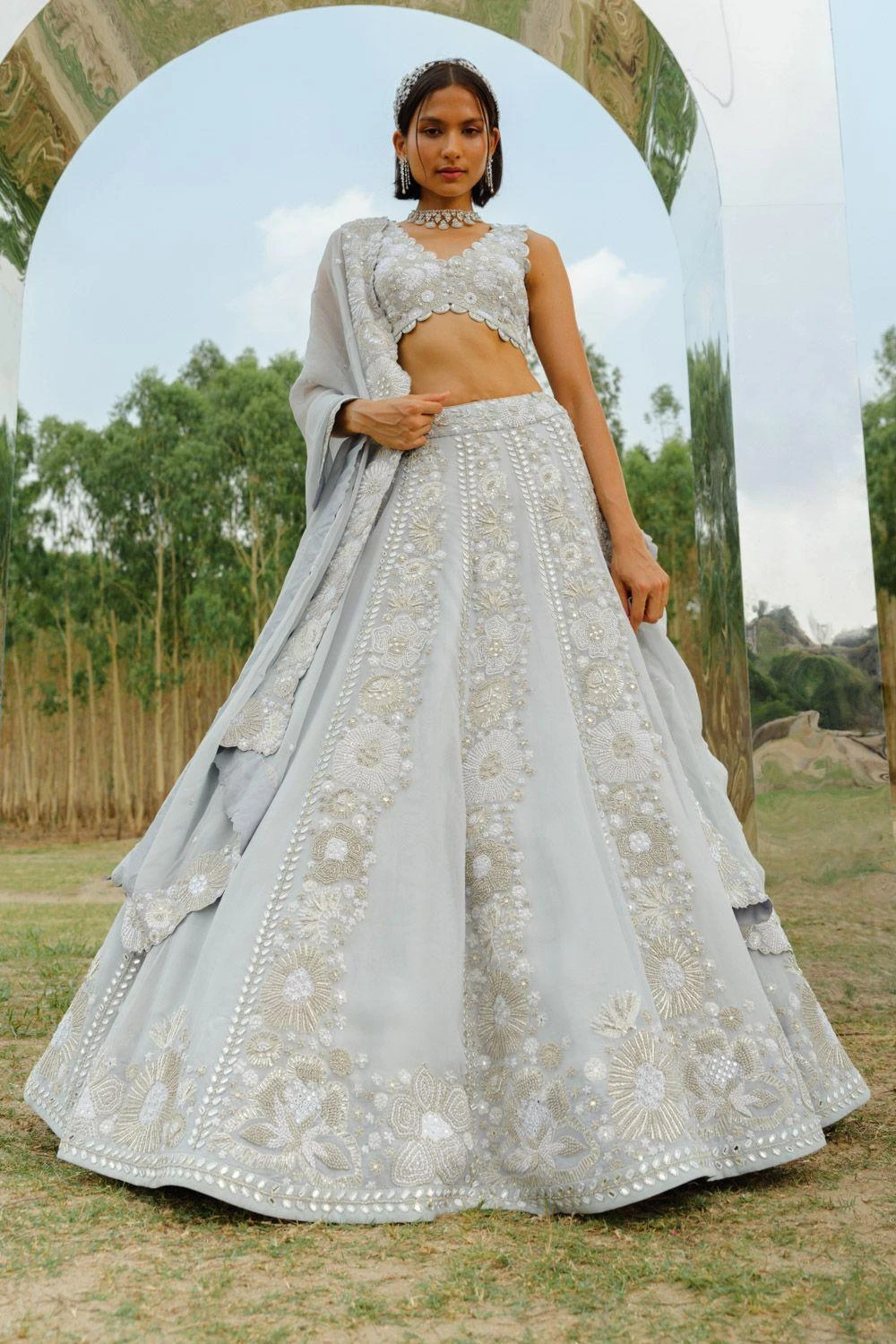 This lehenga set will see you through all kinds of fesivities. It features an embroidered lehenga paired with a blouse & a cutwork dupatta. This set features hand embroidery finished with silk threads,frenchknots, zari, mirrors & sequin work.