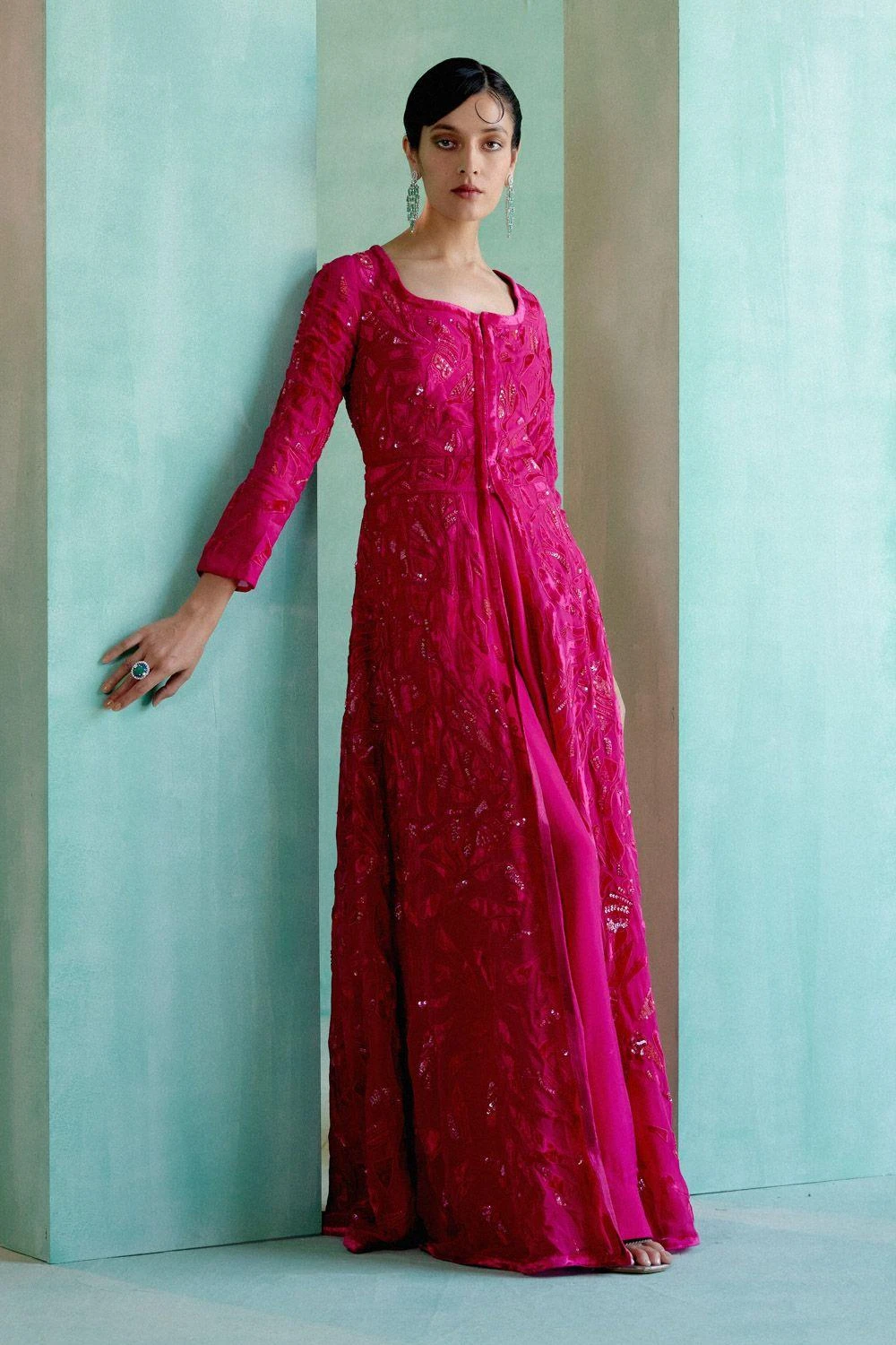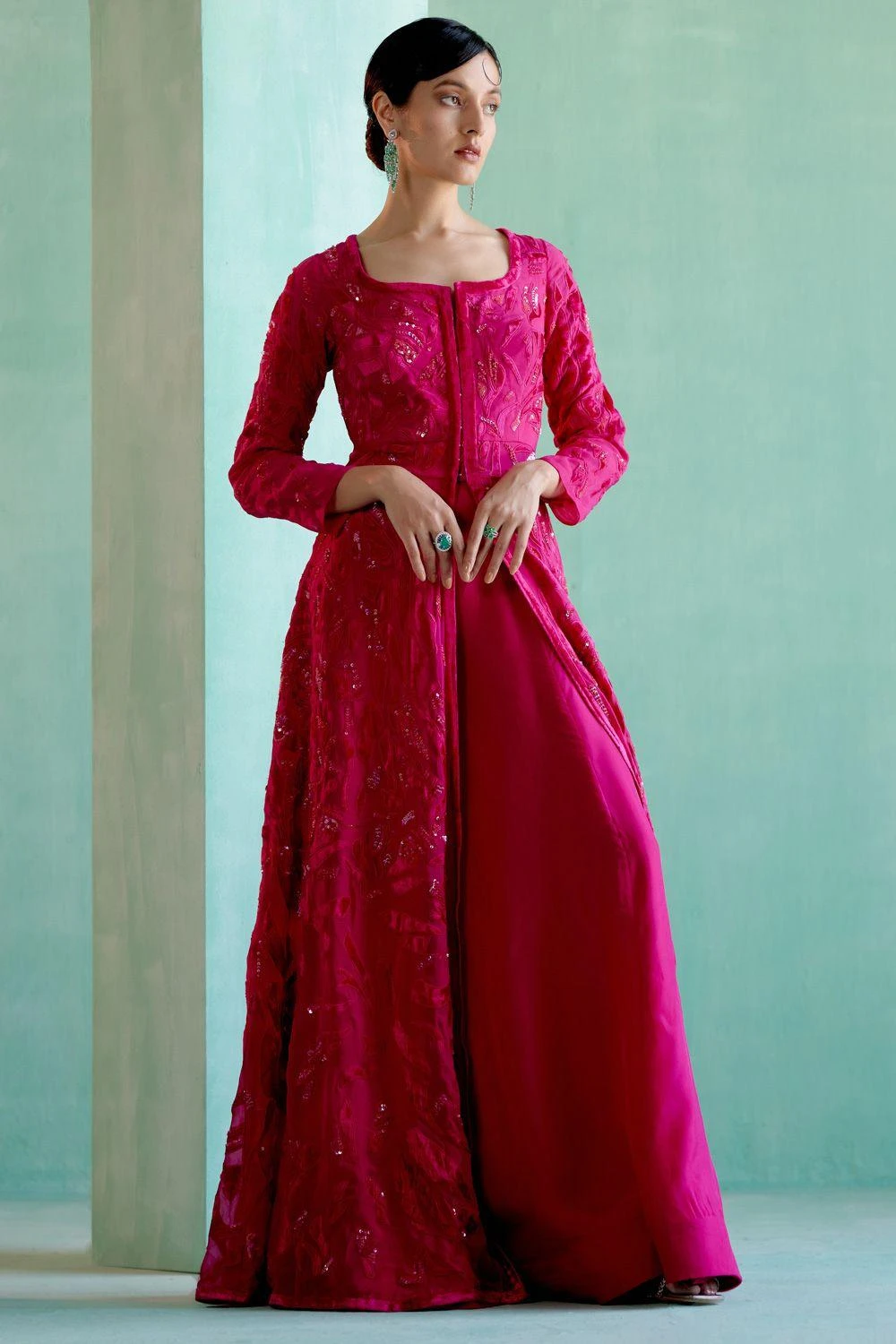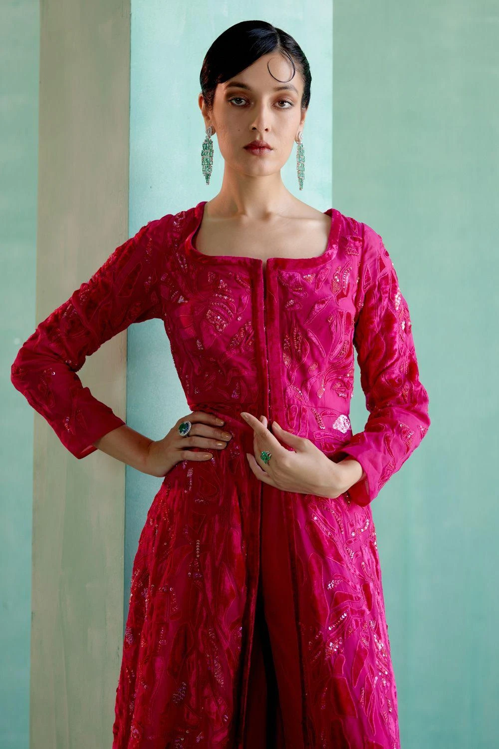 Indulge in opulence with this velvet applique and encrusted embroidered front-open jacket, effortlessly paired with coordinating pants. A fusion of luxury and style for a truly lavish ensemble.