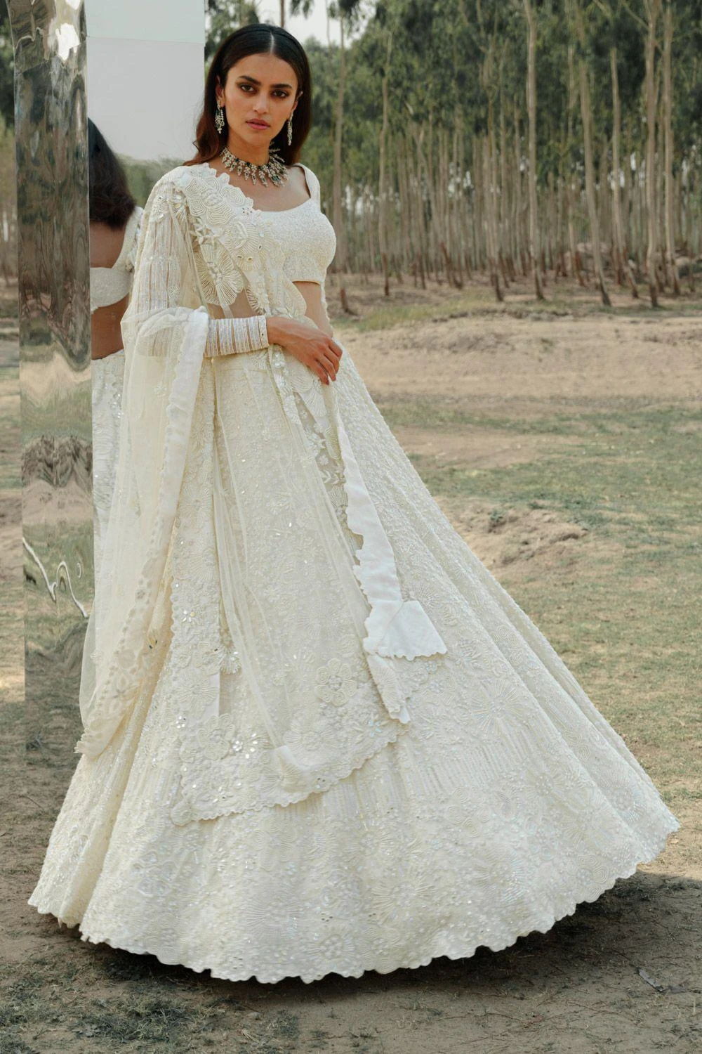 This ivory lehenga set will see you through all kinds of festivities. It features a floral embroidered lehenga paired with a full sleeve blouse & dupatta. This set is hand embroidered with silk threads, pearl beads cutdana and sequins.