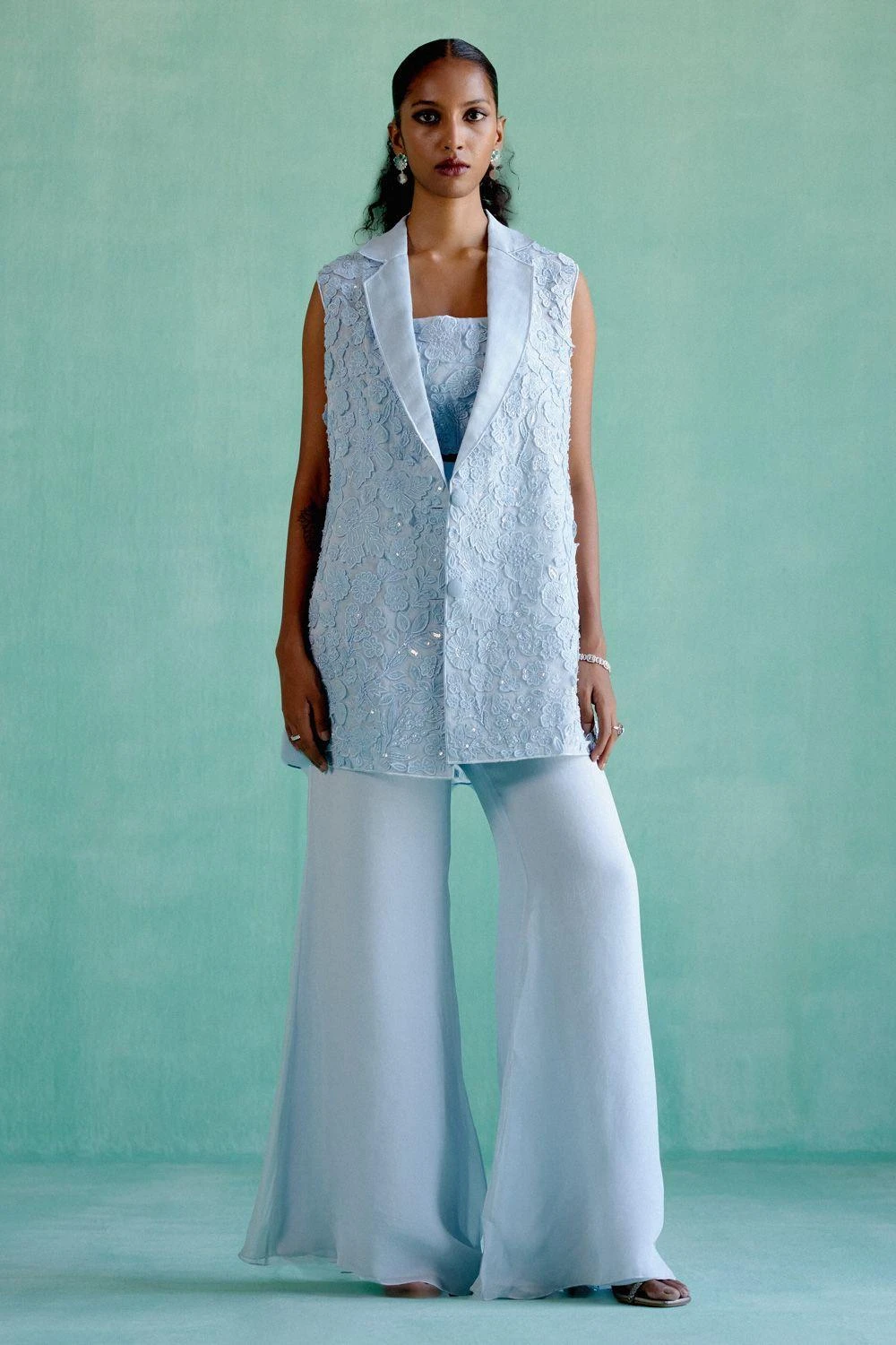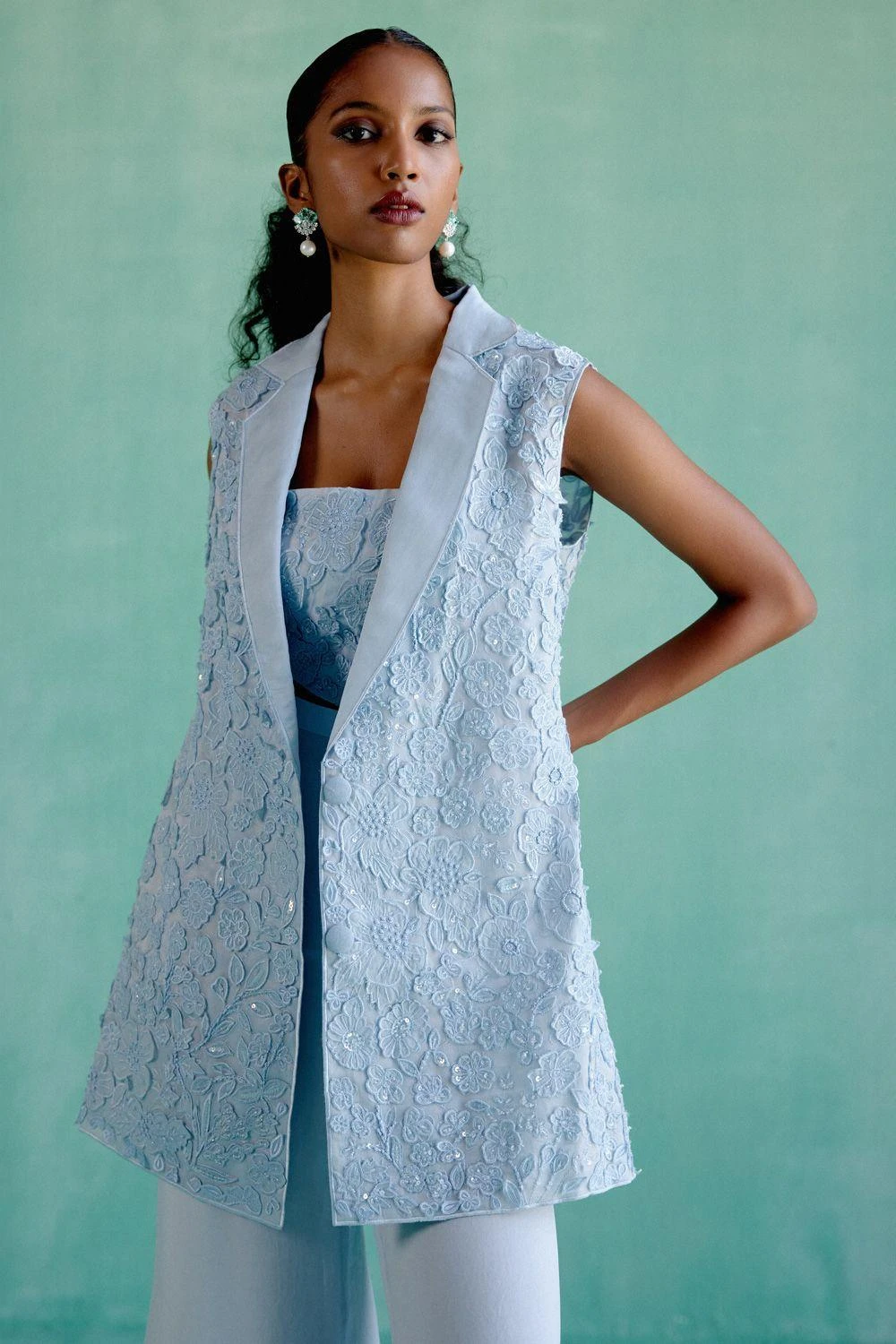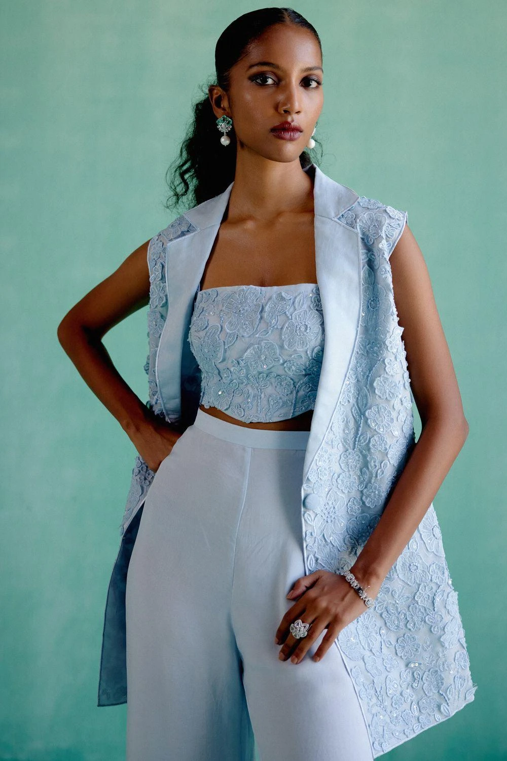 Elevate your elegance with this dense 3D embroidered blazer, paired with a chic crop top and pants. This ensemble combines intricate detailing and style for a sophisticated and captivating look.