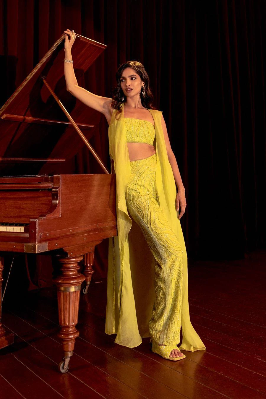 Swap your dupattas for capes this wedding season. Crafted in organza and chanderi, this set features an embellished jacket paired with a crop top and pants. Add a pair of statement earrings to complete the look.