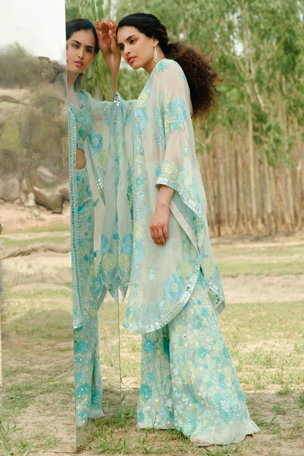 Swap your dupattas for capes this festive season. This set comes with a long floral cape paired with a crop top & pants. The intricate hand embroidery finished with silk threads, cutbeads, mirrors and sequins add glamour to this modern look.