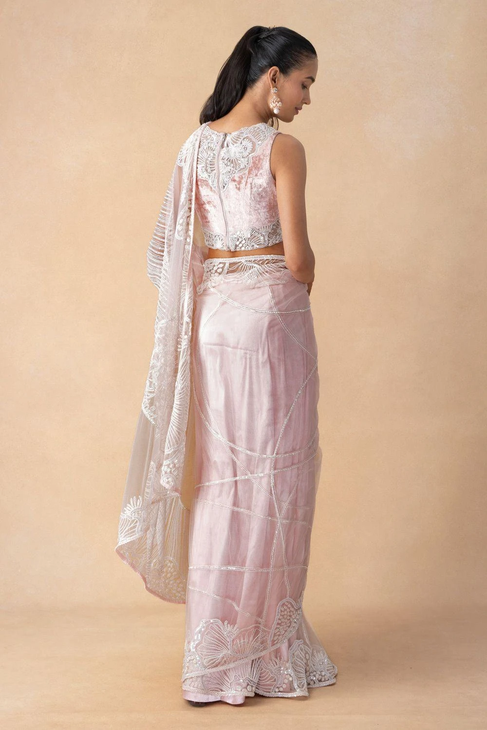 Step into opulent elegance with this embroidered sari set. This ensemble is a testament to the perfect fusion of intricate craftsmanship and modern sophistication, setting the stage for a remarkable look.
