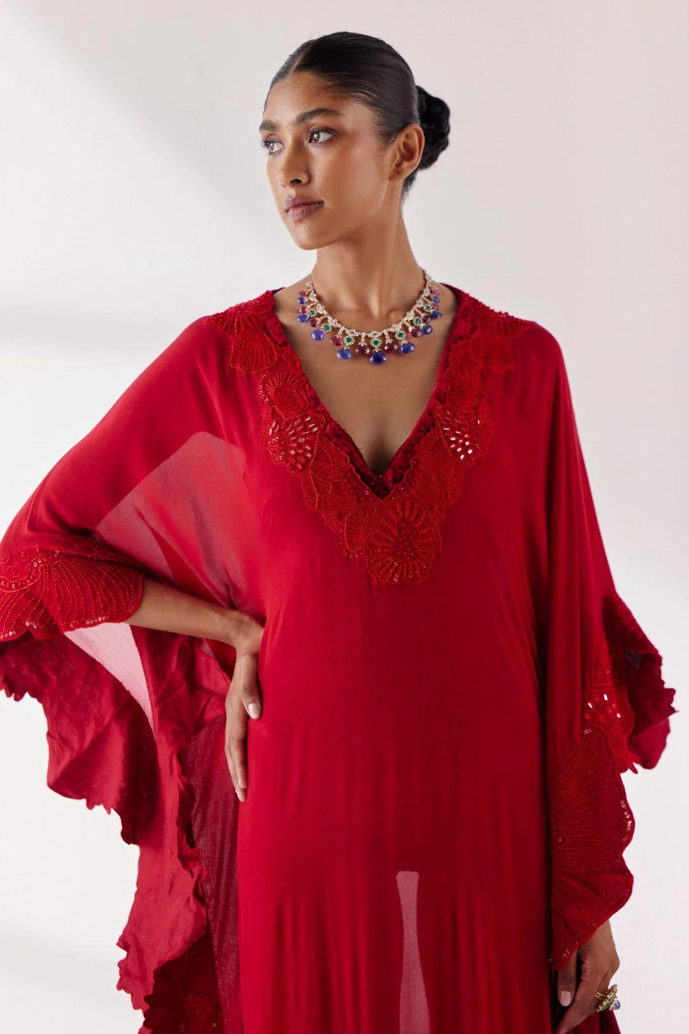 Step into opulent elegance with this embroidered kaftan. This ensemble is a testament to the perfect fusion of intricate craftsmanship and modern sophistication, setting the stage for a remarkable look.