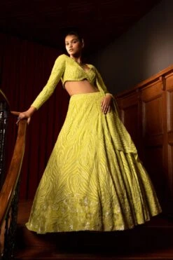Experience the artistry of this abstract lines and floral embroidered lehenga, exquisitely paired with a detailed Art Deco dupatta & blouse. This ensemble captures the essence of elegance & sophistication, making a statement at any grand celebration.