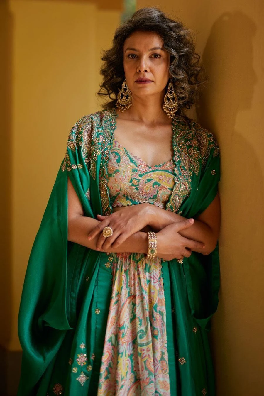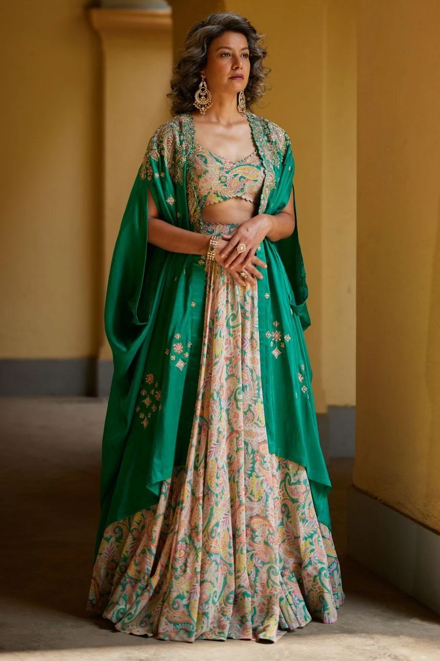 Graceful & captivating, this green silk cape is adorned with exquisite Paisley embroidery crafted with resham and zardozi threads. The ensemble is complemented by a sleeveless blouse and printed skirt, both displaying a textured and printed design.