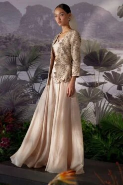 Swap your dupatts for jackets this wedding season. Crafted in silk, this set features a hand embroidered jacket paired with flared pants and a blouse. Add a pair of statement earrings & a potli to complete the look.