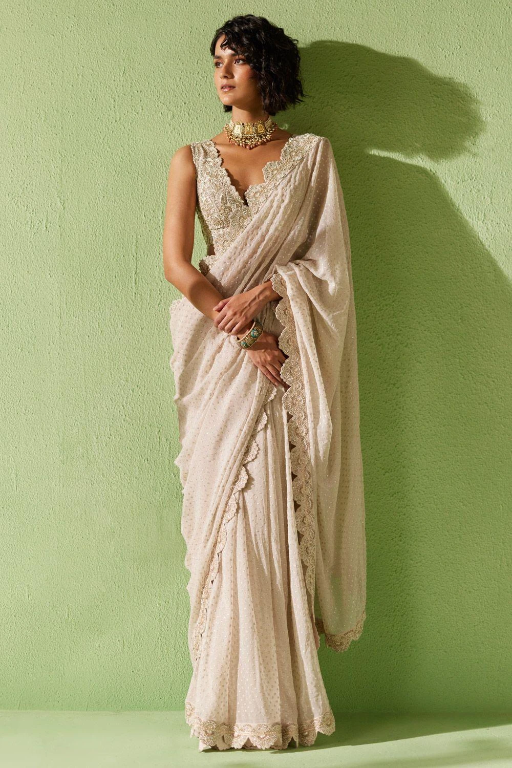 Elevate your style with this Ivory sleeveless blouse, boasting a plunge neckline and adorned with exquisite ivory resham, zardozi, and pearl hand embroidery. A perfect choice for sophisticated elegance.