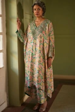 Adorn yourself in the effortless grace of the relaxed fit printed silk kaftan paired with straight pants. The zardozi embroidered neckline and cuffs, crafted with exquisite applique work, add a touch of opulence to the ensemble.